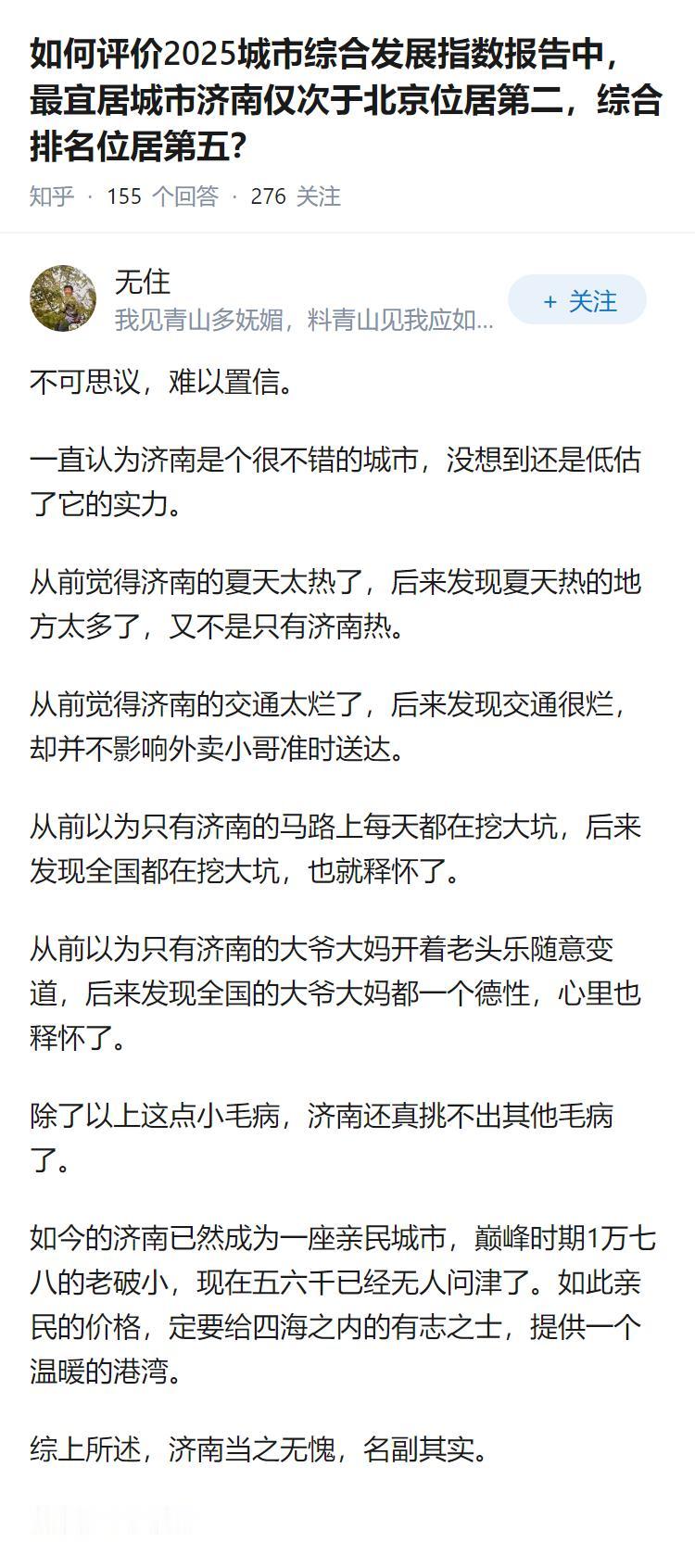 如何评价2025城市综合发展指数报告中,最宜居城市济南仅次于北京位居第二,综合排名位居第五?