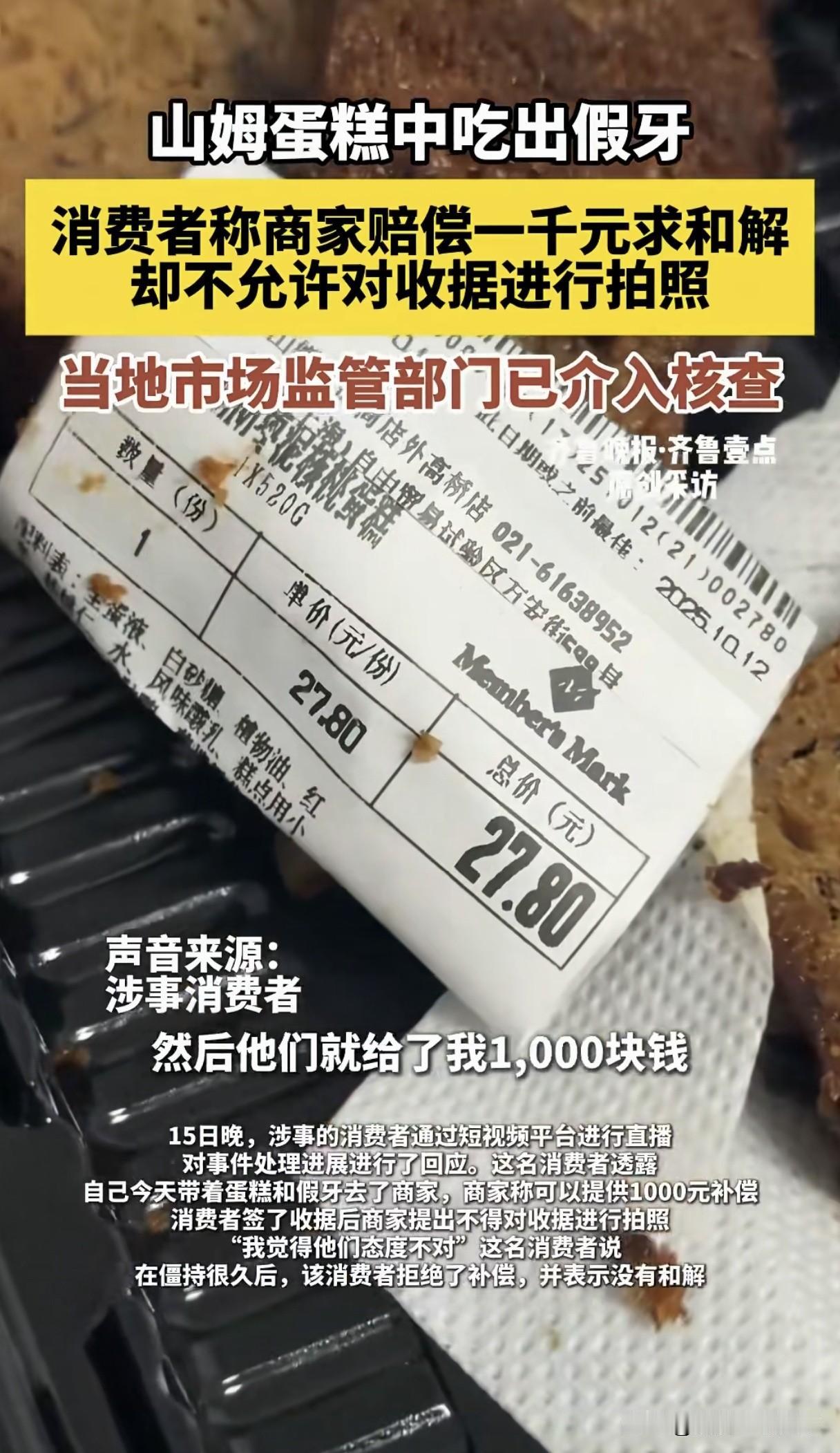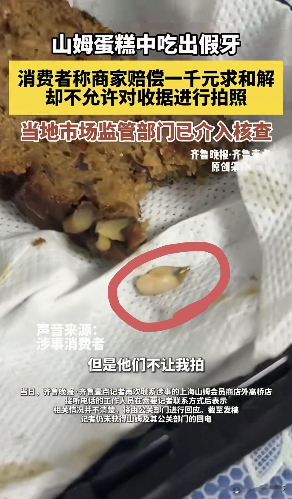 好家伙,在山姆买的蛋糕🍰中竟然有假牙!山姆想花1000元赔偿私了,条件是顾客不得对收据进行拍照,顾客拒绝了直接选择曝光。 如果是你,你会选择收1000块和解,还是选择曝光呢? 我先说我自己的看法,对于这种事必须曝光,这是企业卫生和态度问题,要让更多的人知道这件事,不会为了1000块而妥协! 不知道大家对此事怎么看?欢迎留言一起探讨交流。 山姆配料 山姆自提蛋糕 山姆塌方 山姆蛋糕吃出假牙