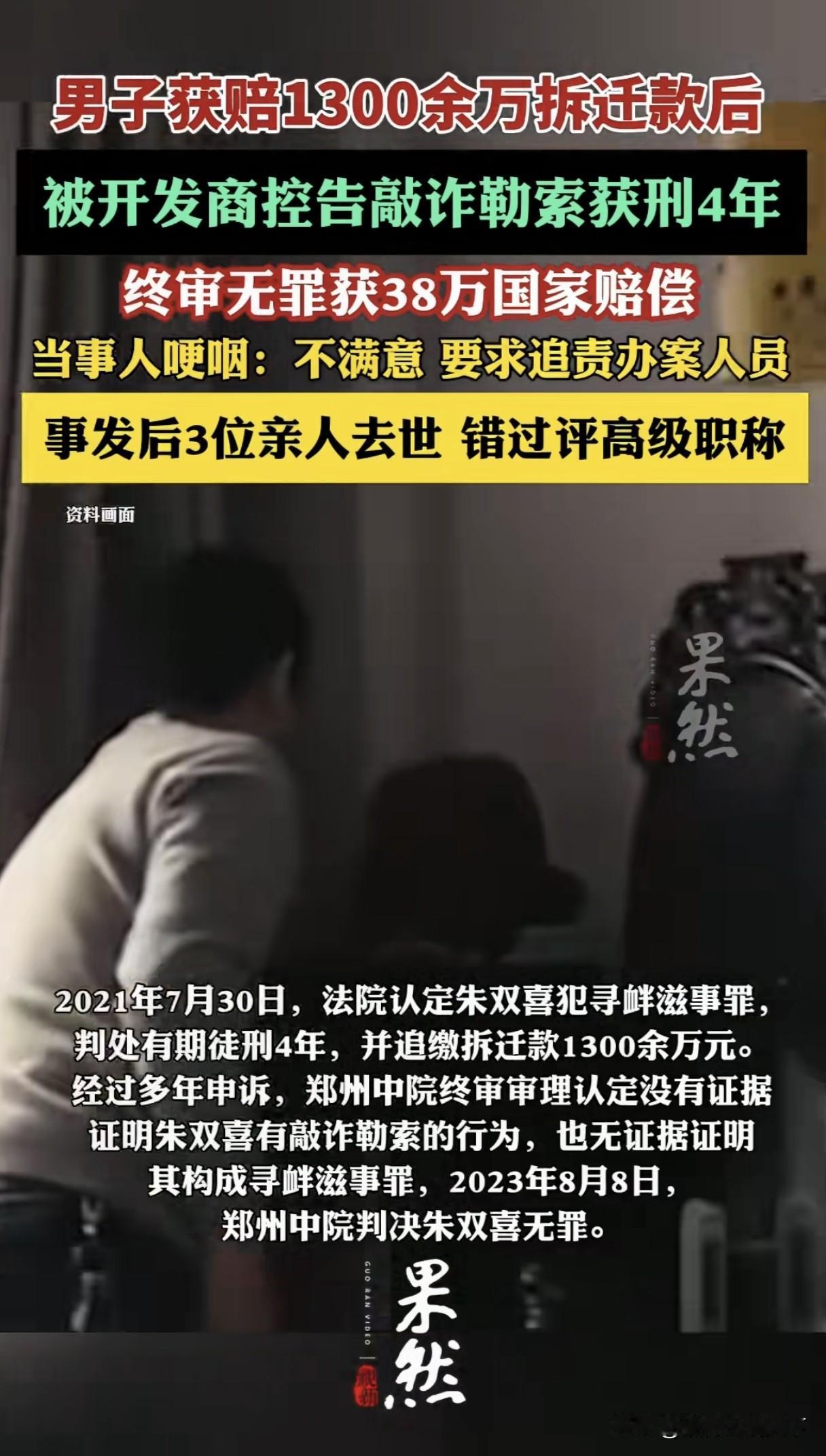 哦豁,被诬告判了4年,最终被无罪释放,获得38万赔偿你愿意吗? 河南郑州,朱双喜因为1300完的拆迁款,被冤枉判了4年,原因是“寻衅滋事”、“敲诈勒索”,关了几年后法院判决没有证据证明,最终朱双喜无罪释放,并获得国家赔偿38万! 这件事存在几个问题:一、为何没有证据就能给人判刑?二、原来参与办案人员是不是要追责?三、这个国家赔偿的钱是不是要那些参与办案的人来出? 有网友表示:对于冤判的案件,也要对相关公职人员处以同等时间、经济处罚,赔偿金不能由纳税人来出! 有网友表示:真不敢相信 2021 年还能出现冤假错案,而且是三个环节都错,说明什么问题?好好反思一下。 有网友表示:看了很多说办案人员要追责的,但是大家有没有想过,如果这样的话,再有冤假错案,翻案的难度会增大还是减小? 不知道大家对此事怎么看?欢迎留言一起探讨交流。