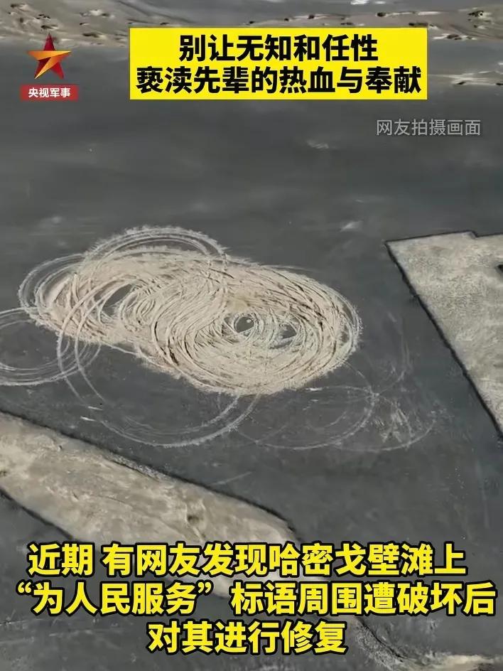 新疆戈壁滩“为人民服务”标语,它扛住了60多年的风沙,却没能抗住越野车的撒欢! 这是空军第八航校在上世纪60年代刻下的巨形标语,每个字有50米见方,用做飞行的地标,防止空中的飞机迷失方向。 30个字5组标语,空军官兵们用尺子量、用铁锹铲,整整花了八天时间才完成。每一个标语,都凝聚着他们的心血和汗水! 戈壁滩那么大,但某些人偏偏却选择在这里撒欢!他们开着越野车,在“人”和“民”中间肆意漂移,留下了很深的车辙印,他们就是故意在“人民”中间搞破坏! 这些飞行地标,是先辈留下的精神财富,被有些人故意毁坏,实在令人痛心! 建议相关部门严查此事,找到故意破坏标语的人进行严惩,给全国人民一个交代!