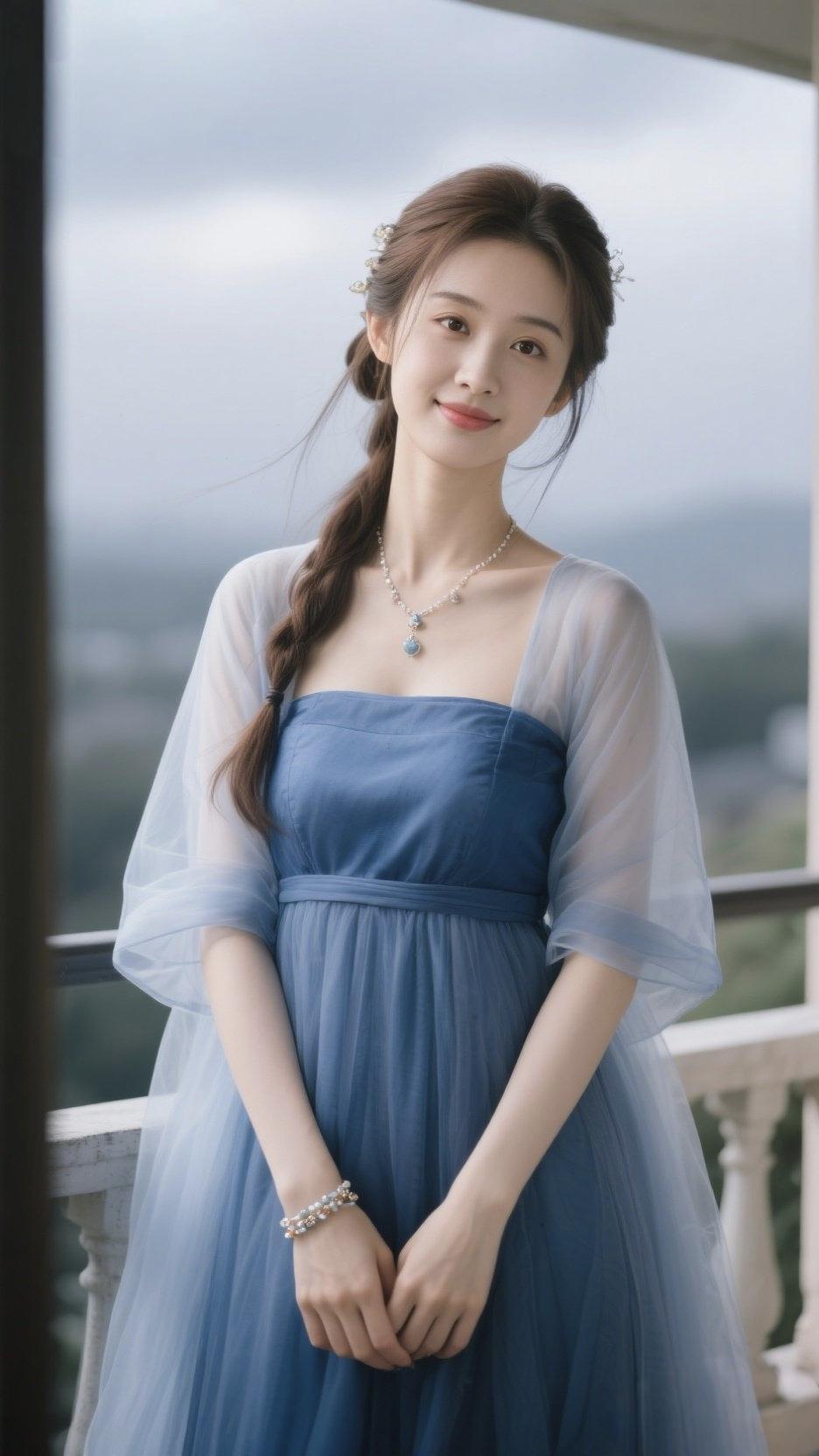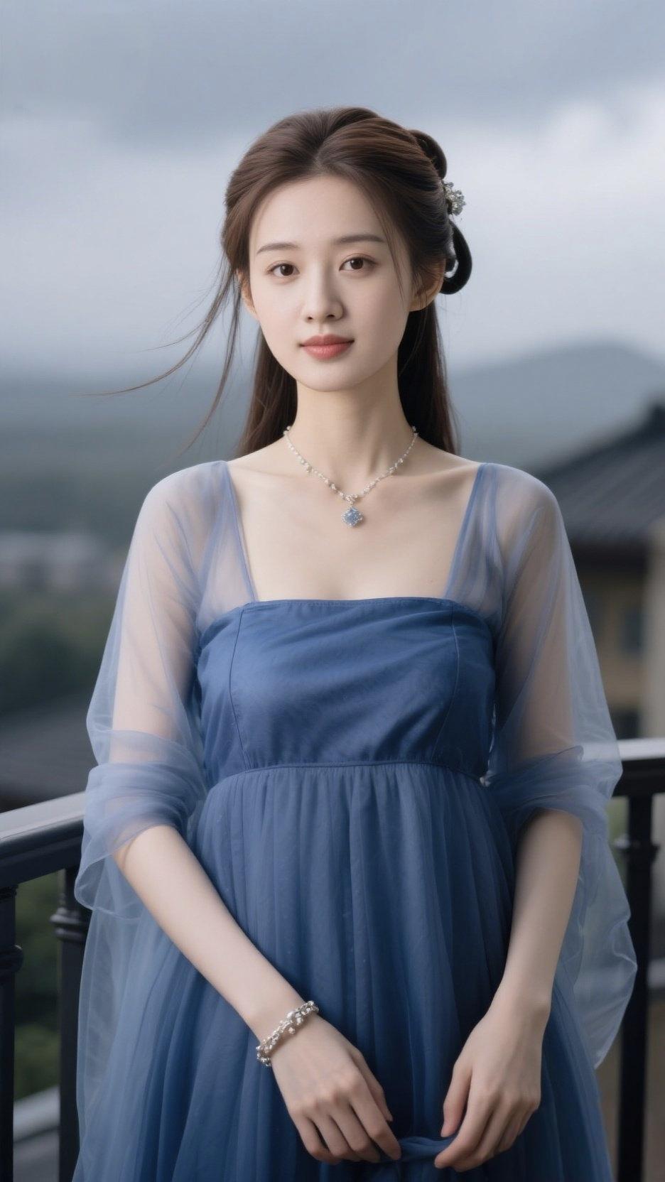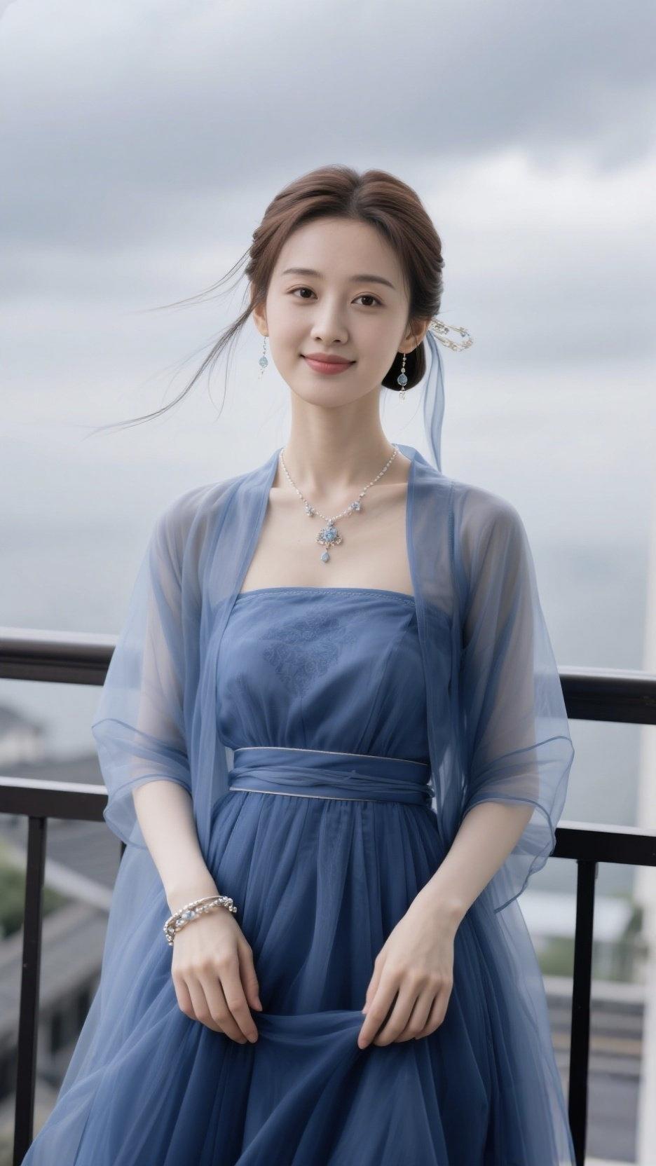 蓝纱仙影 她仿若谪仙临凡,靛蓝纱裙似揉碎了天际的烟岚,薄透披帛在风里漾出朦胧涟漪。颈间银链坠着冰蓝琼蕊,腕上银镯亮着碎星微光,发髻簪花与远山云霭相融。在这清寂天地间,她把江南的柔婉与阆苑的空灵织就一身,每一次眸光轻抬,都似有仙气在流转,恰是画中走出的灵韵佳人。