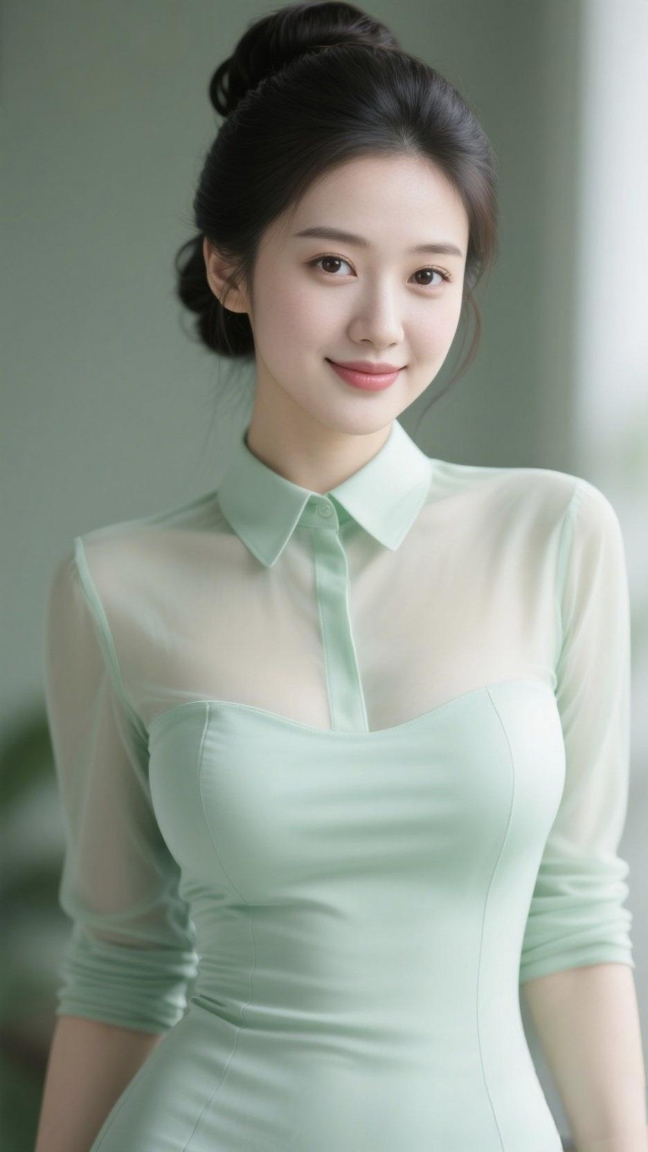 上联:浅翠衣轻,一抹清姿含雅韵 下联:云髻影静,几分温婉入风华