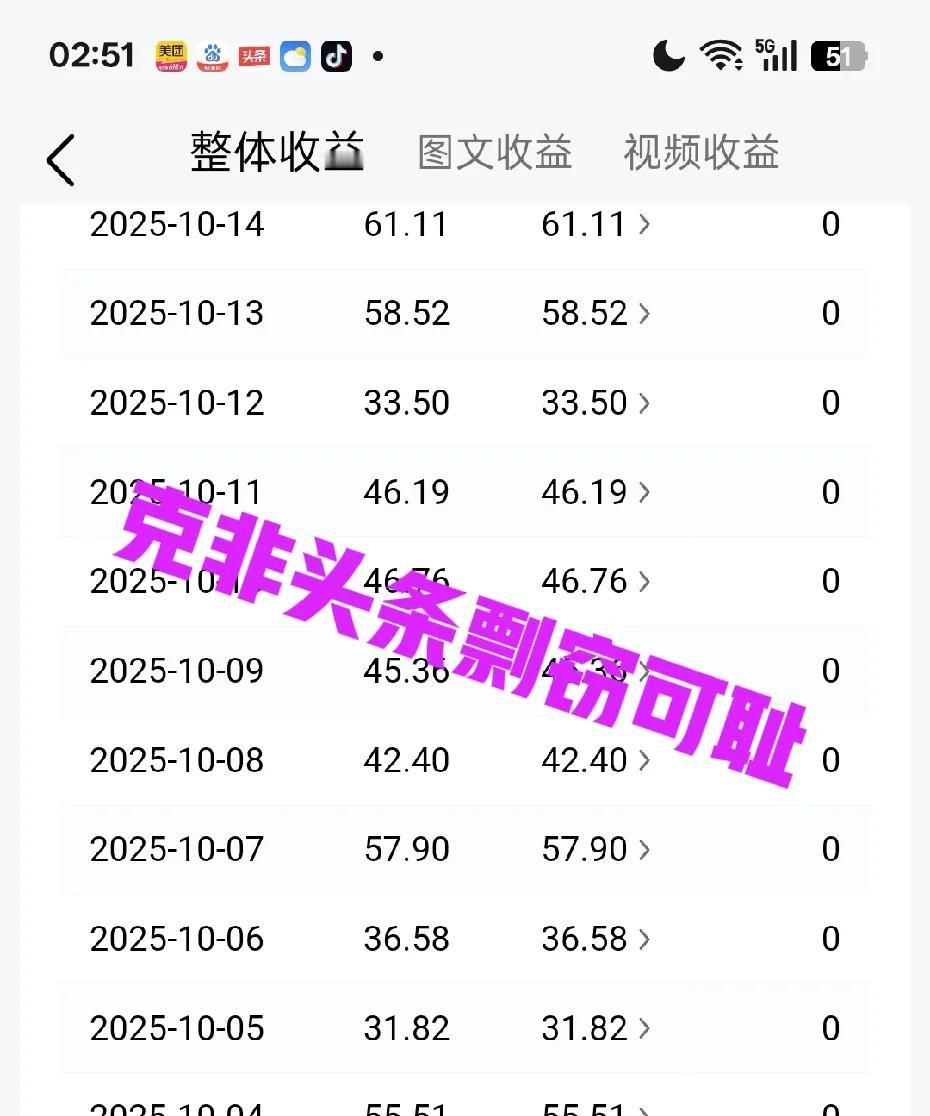 我昨天的收益是61.11元,虽然是新规前差不多四分之一,但是,这段日子里收益一直滑坡,每天50块钱以上的都少,总是低收益,冷不丁蹦出来个61块钱,也挺高兴的。 头条还坚持写下去不?估计好多网友都跟我有一样的想法。 头条写作的确不容易,要想每天挣100块钱,这在新规前容易,现在感觉非常难。一般的写手,想一天突破100块钱收益,得全天在头条上抠字抠至少8个小时,比打工劳神,费心血。 但是,我感觉也得写,别放弃。 一天10块钱也是钱。 改变写法,不写长篇大论文章了,耗时间长,还不一定有人看。 就写微头条,每个不超过800字,最好别多写。现在网民事儿都多,篇幅太长没有人看。 网民到底想看什么?其实跟抓彩票差不多,咱们也拿捏不准,说头条有流量密码,那也是扯犊子。点击率高就是流量密码。阅读量多,文章就是高质量。 我的感觉就是,每天至少写八个微头条,去撞大运,搏流量。不写肯定没有流量,写了也不一定有,但是多写就有可能有一篇成为小爆款,有几万人阅读,今天就没有白付出。 那么写什么?每天更新七八个800字微头条,上哪里找素材? 其实日常生活中能写的事情非常多,自己闭门造车不行,溜达出去,捕捉你认为大家爱看容易引起共鸣的事情,就是一个层面的共鸣就可以了。比方邻居老王头去养老院了 ,走前多么留恋住了几十年的家,写写老王头临走前,在家屋里屋外来回走。 一件事儿,可以多维度多角度去写,寻求共鸣感。 外部观察是一方面,也要天天保持一定时间的阅读,去深读一本书,比方去读沈从文的《边城》从翠翠忽然想起来,多少年前自己的初恋情人。 灵感会突然在读书中产生,这个时候放下书拿手机就写。 写,还是要多写积极向上,努力生活的东西,用故事说明事理。不是抽象的告诉人们应该如何如何。