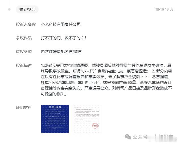 二、文章在无事实依据、未了解事故全貌的情况下,恶意杜撰“小米汽车自燃、车门打不开”等内容,抹黑其产品质量、诋毁结构设计合理性,误导公众,对品牌造成不可挽回的损失。