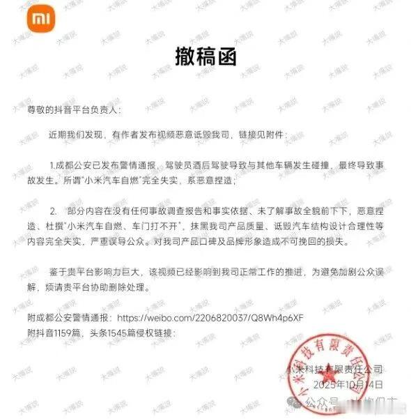 投诉描述中,小米方面提出两点主要理由:一、成都公安已发布警情通报,认定驾驶员系酒后驾驶导致车辆碰撞,所谓“小米汽车自燃”属恶意捏造;