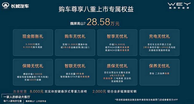10月15日,魏牌高山7正式上市,售价28.58万元,采用2+2+3的座椅布局。