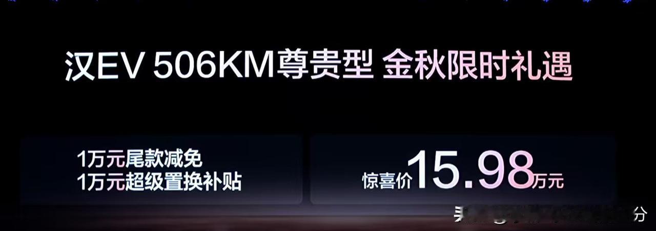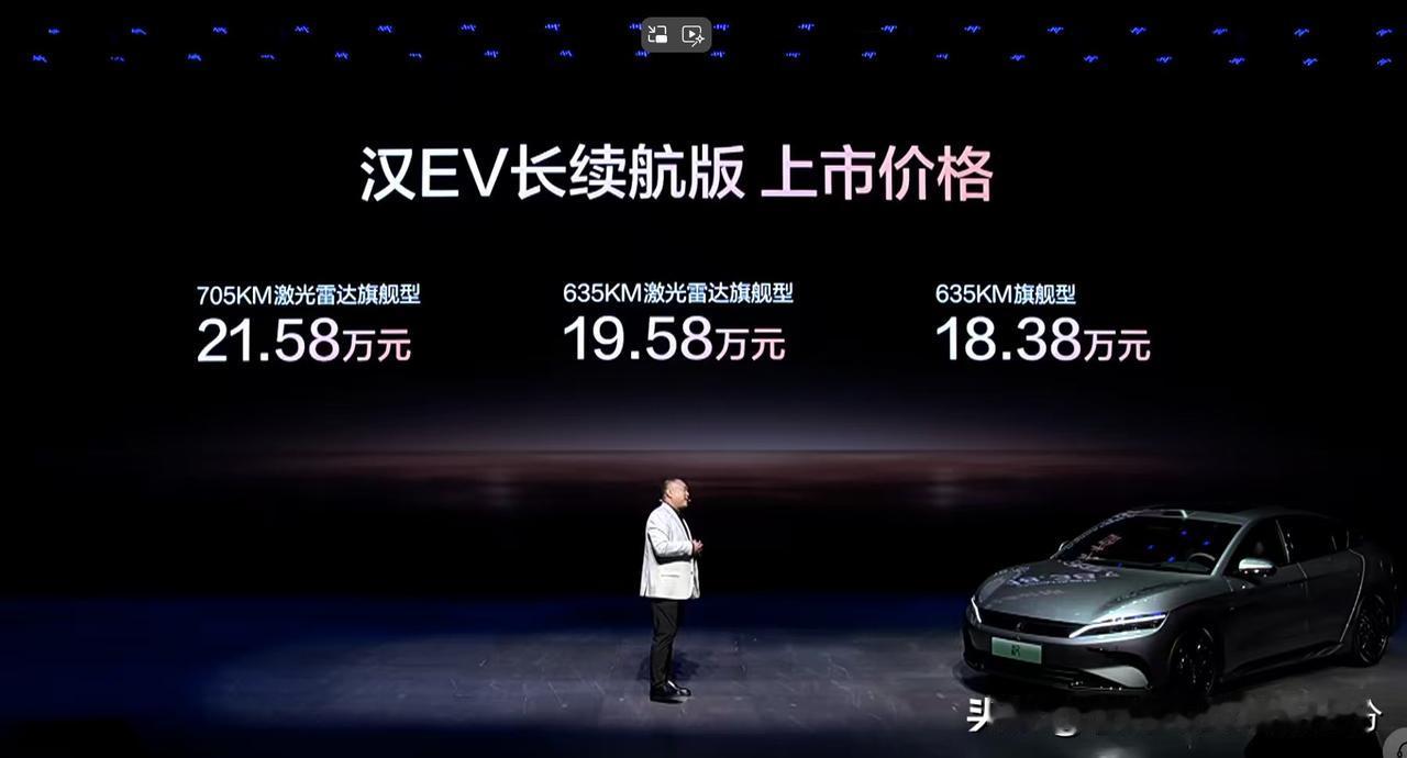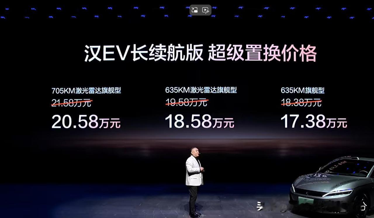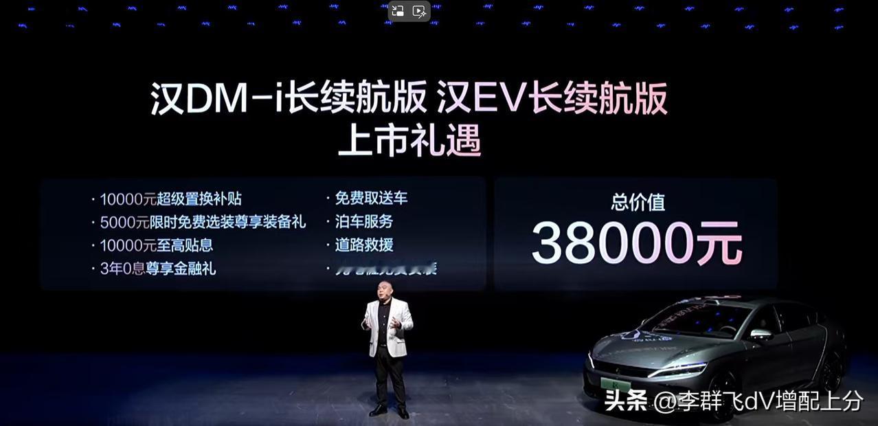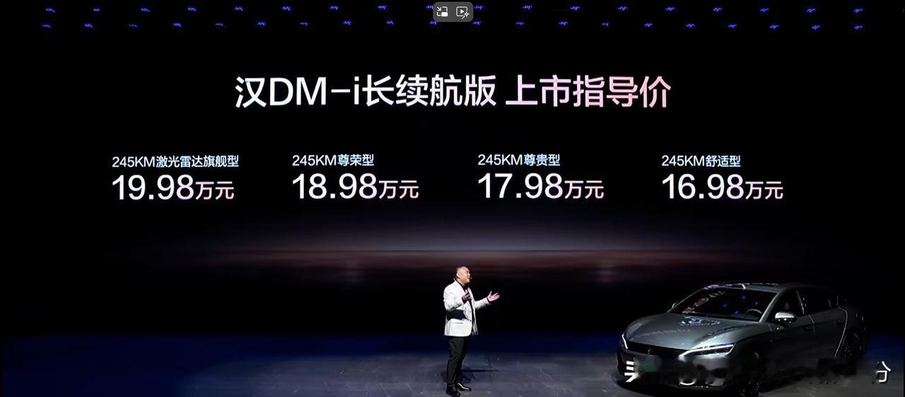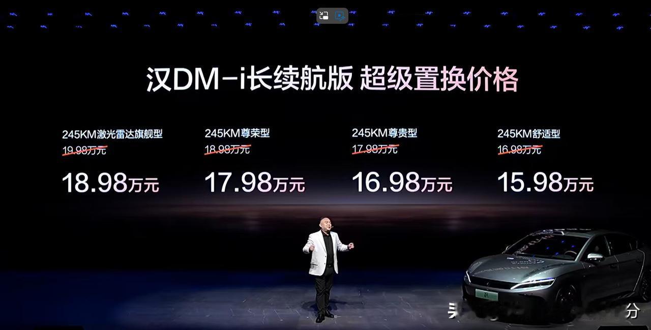 比亚迪汉又进化了,怀档和小蓝都有了,纯电续航也提升到了245公里 比亚迪的发布会变了[呲牙][呲牙][呲牙] 除了讲技术,说黑科技 现在还说上了冰箱,谈车色,扯无麦K歌,论宠物座椅,聊SPA、游戏厅。 最后说到技术:云辇C➕预描,高速爆胎,天神之眼B。 关于价格: 汉245公里DMI长续航版算上一万元的置换补贴15.98万起,价格还是很香的。 9月份上市的506纯电低配限时15.98万。 一共7个版本,混动四个,纯电三个。 最后说下亮点吧 油耗又又又降了! DMI油耗从3.8降到了3.35升,有测试博主实际测试为3.29升! 纯电为每百公里10.6度电,基本上跟小车一个水平了。 这价格,这油耗,给予好评。