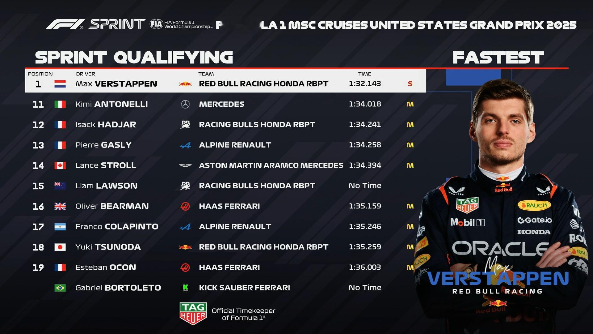 美国大奖赛周五冲刺赛排位赛成绩表如图F12025F1美国大奖赛