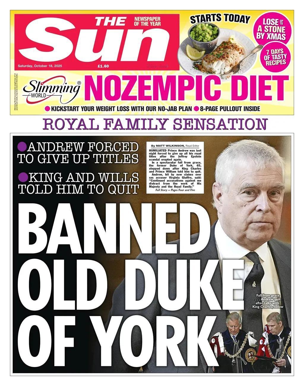《太阳报》声称,英国王室成员安德鲁王子在被迫放弃所有王室头衔后,他的前妻已经遭到“羞辱”,并经历了“显著的落幕”。 但他仍将保留英国王子的身份。他的前妻莎拉·弗格森也将不再使用约克公爵夫人的称号。他的二个女儿则不受影响,可以继续享受皇家头衔与待遇。