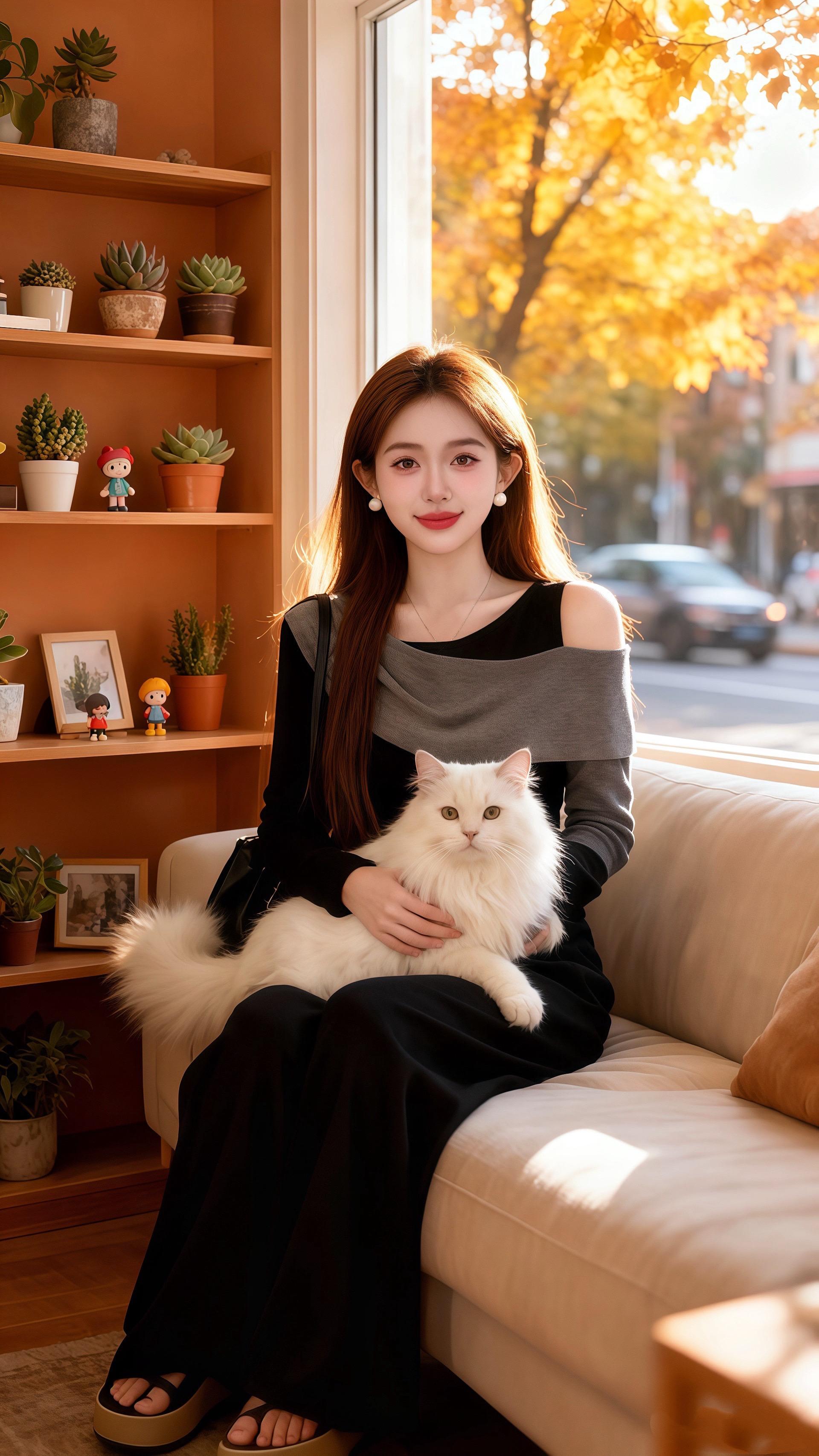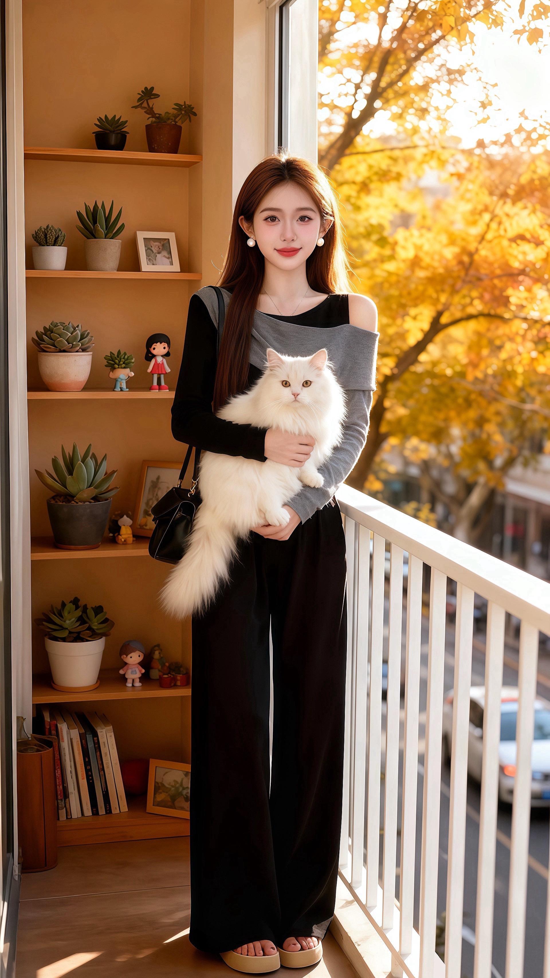 秋日的暖阳透过阳台的落地窗,给室内镀上一层温柔的金边。许妍穿着灰黑撞色的露肩上衣,搭配垂感十足的阔腿裤,指尖轻轻抚过怀中白猫的软毛,侧头看向刚进门的皓明。