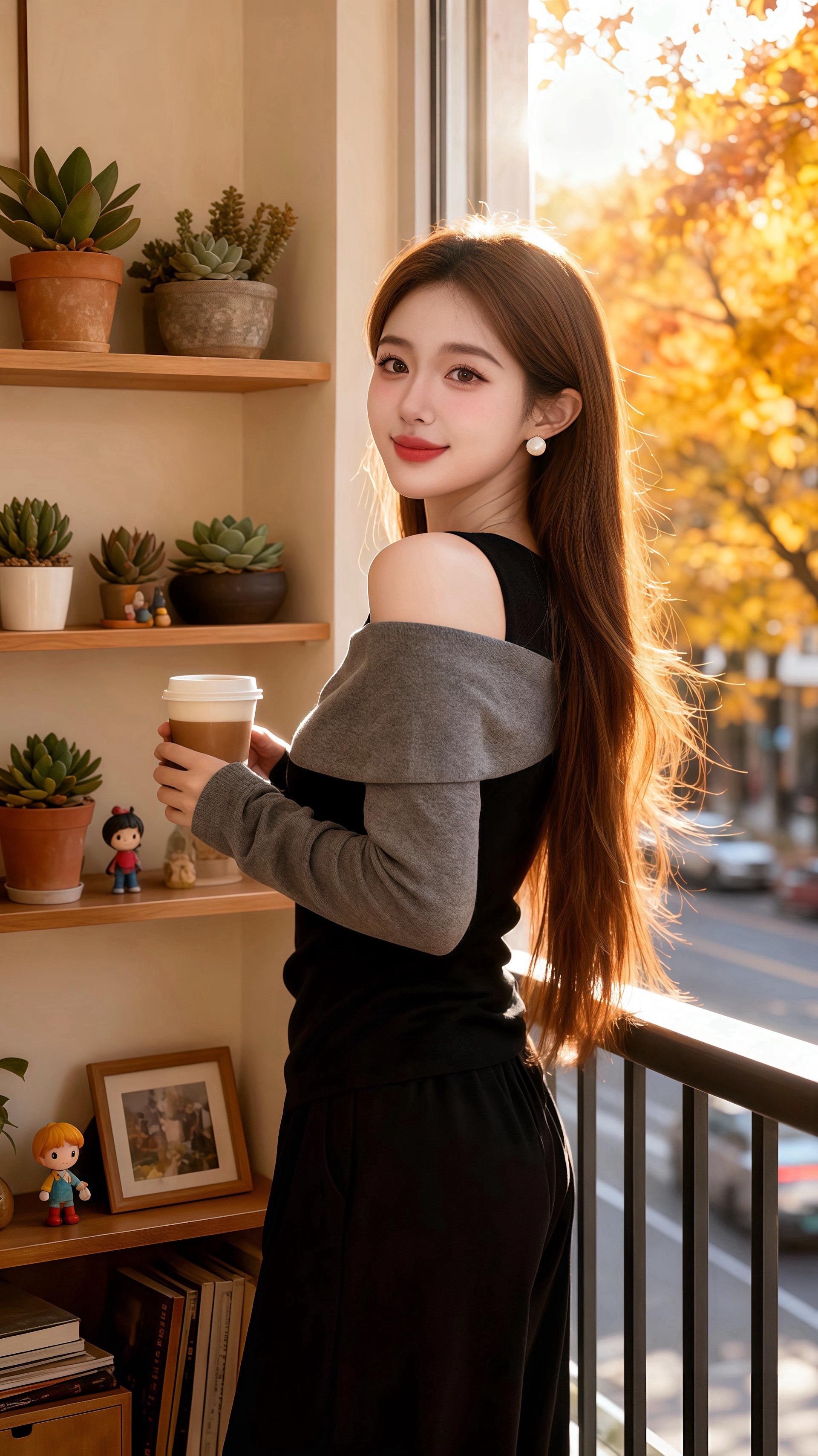 “你今天这身……很有格调。”皓明放下公文包,目光在她身上停留,“露肩的设计把肩颈线条衬得很精致,阔腿裤又添了几分随性的优雅,和这阳台的暖光特别搭。”