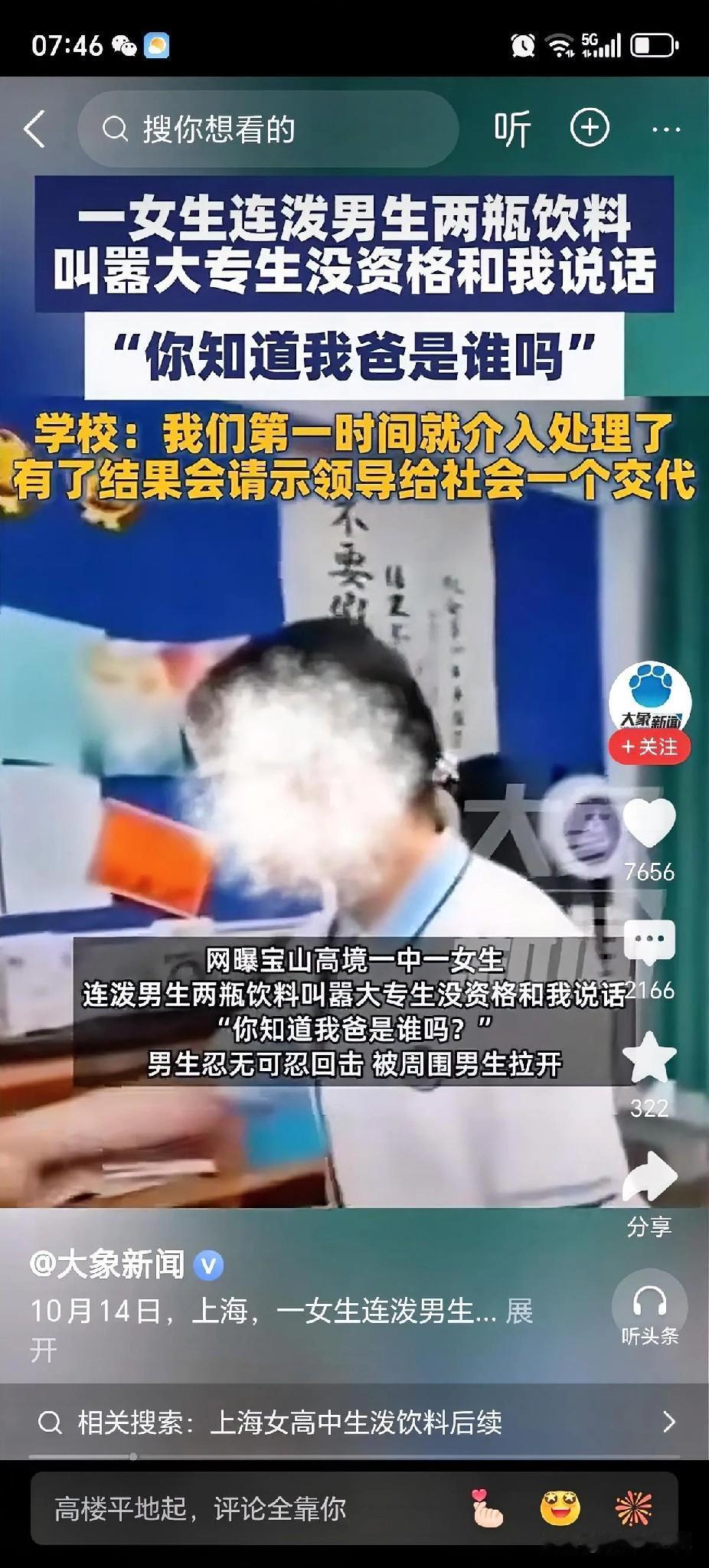 祸从口出,这个高中女孩的嘴真的太毒, 他对男孩大吼“我告诉你,像你这样的中专,大专生都没有资格跟我说话,你知道我爸是谁吗? 性格决定命运,这种性格是家庭教育影响,女孩的成绩也不会太好,可能只是相比,比这个男孩好,真正的学霸不会说话不过脑子? 不知道男孩怎么得罪她了。 不作死就不会死,可怜之人必有可恨之处。