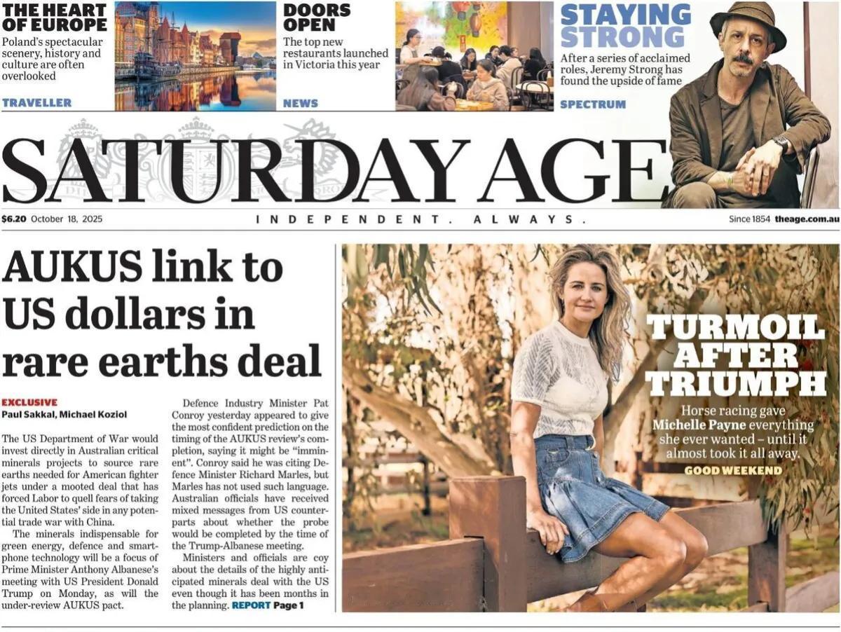 澳大利亚《时代报》头版报道称,美英澳三边安全伙伴关系(AUKUS)在稀土交易中与