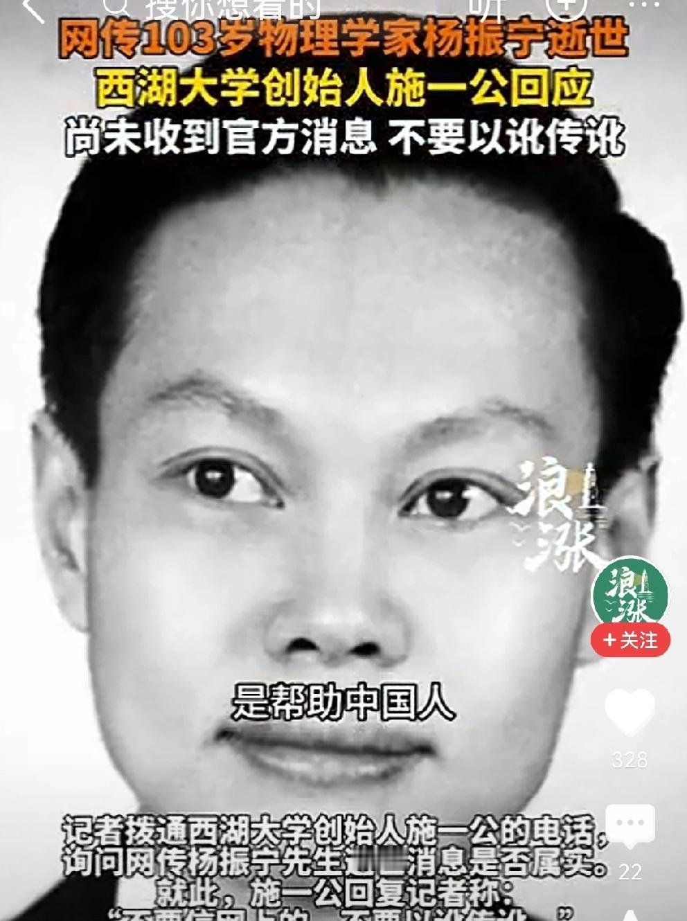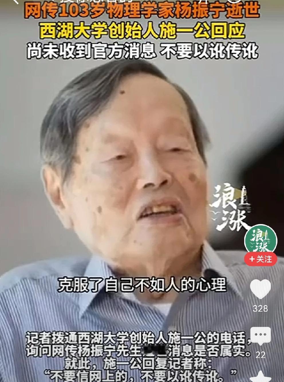 震惊!谣言止于智者! 网传“杨振宁逝世传闻”,施一公院士回应: “不要信网上的,不要以讹传讹。” 杨振宁的科学成绩和伟大贡献,举世闻名,学术界早有定论,毋庸置疑! 杨振宁,他见过毛主席,握手周总理,他是享誉世界的中国科学家! 杨振宁先生曾经谦虚地说: 我觉得我一生最重要的贡献,就是帮助中国人克服了自己不如人的心理。 谣言止于智者,兴于愚者。 良言一句三冬暖,恶语伤人六月寒,嘴下积德,福报自现。 杨振宁 十大科学巨匠