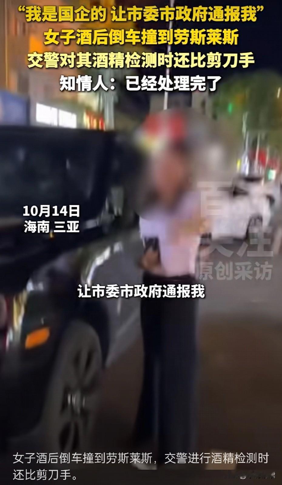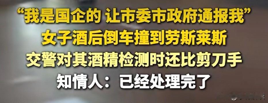 国企的就可以酒后驾车撞劳斯莱斯了了? 海南三亚。据百姓关注报道,有女子在酒后倒车撞倒了一辆劳斯莱斯,然后开始扬言说我现在反正是国企的,要让市委市政府来通报她。 感觉跟广西那个二级消防士有点如出一辙,反正现在是人是鬼,在外面只要有一点点身份,就觉得自己了不起,还是从古至今的金饭碗观念作祟,一个国企的都可以这么嚣张,要是这女的进体制内那就直接上天了