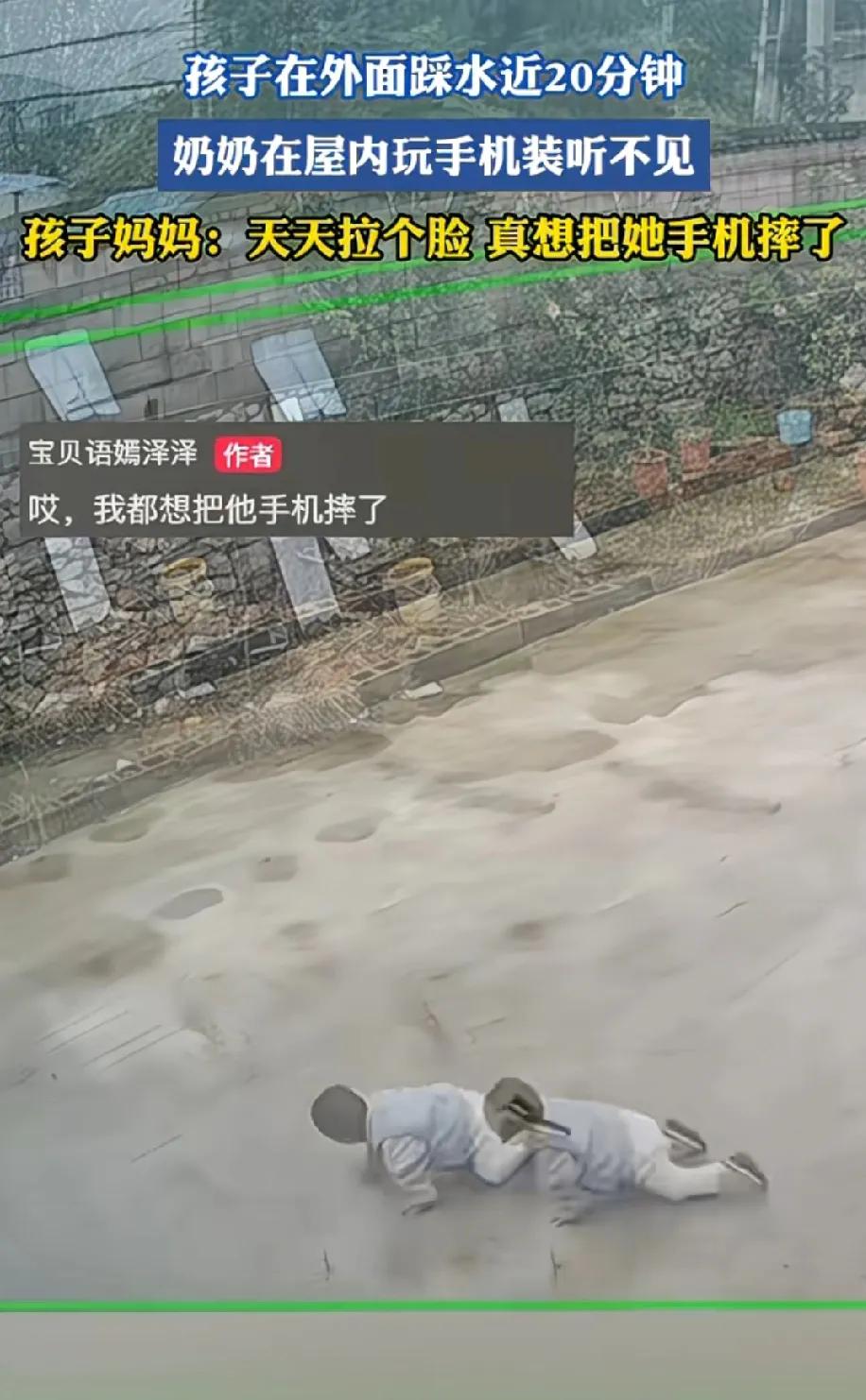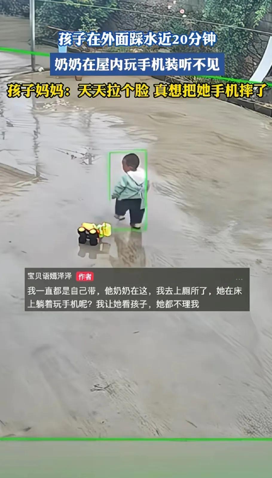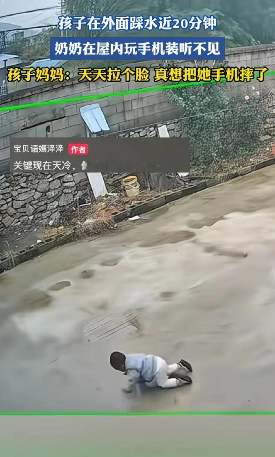 安徽一女子上厕所,让婆婆帮忙看下孩子,婆婆在屋内玩手机装听不见。孩子在外面踩水近