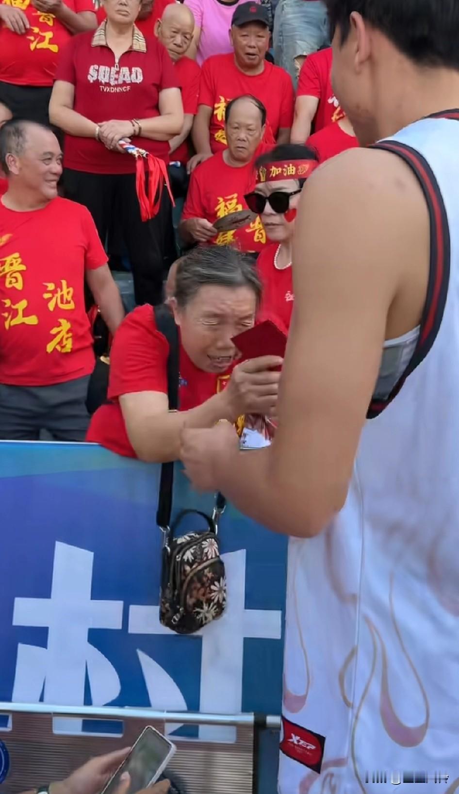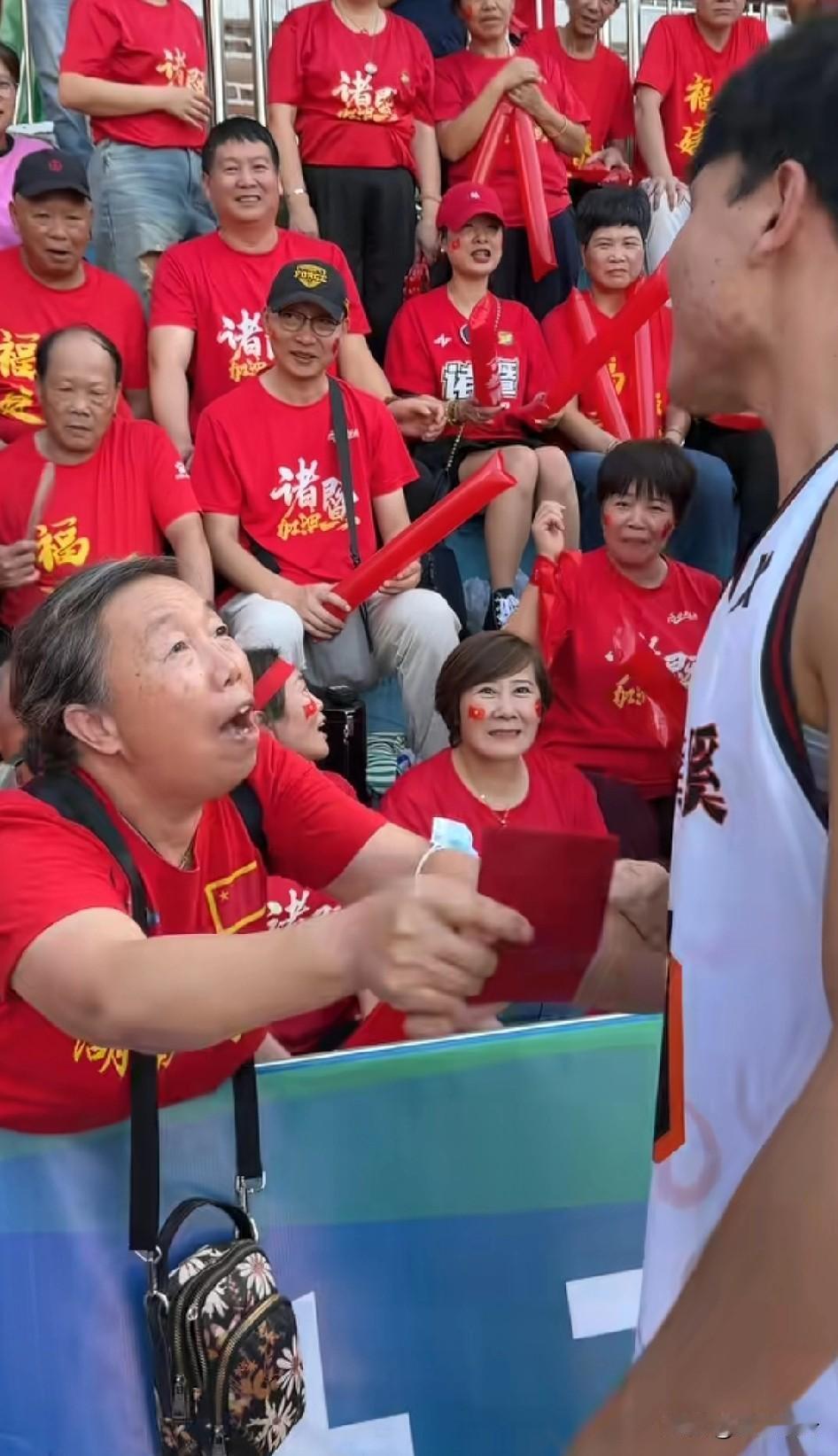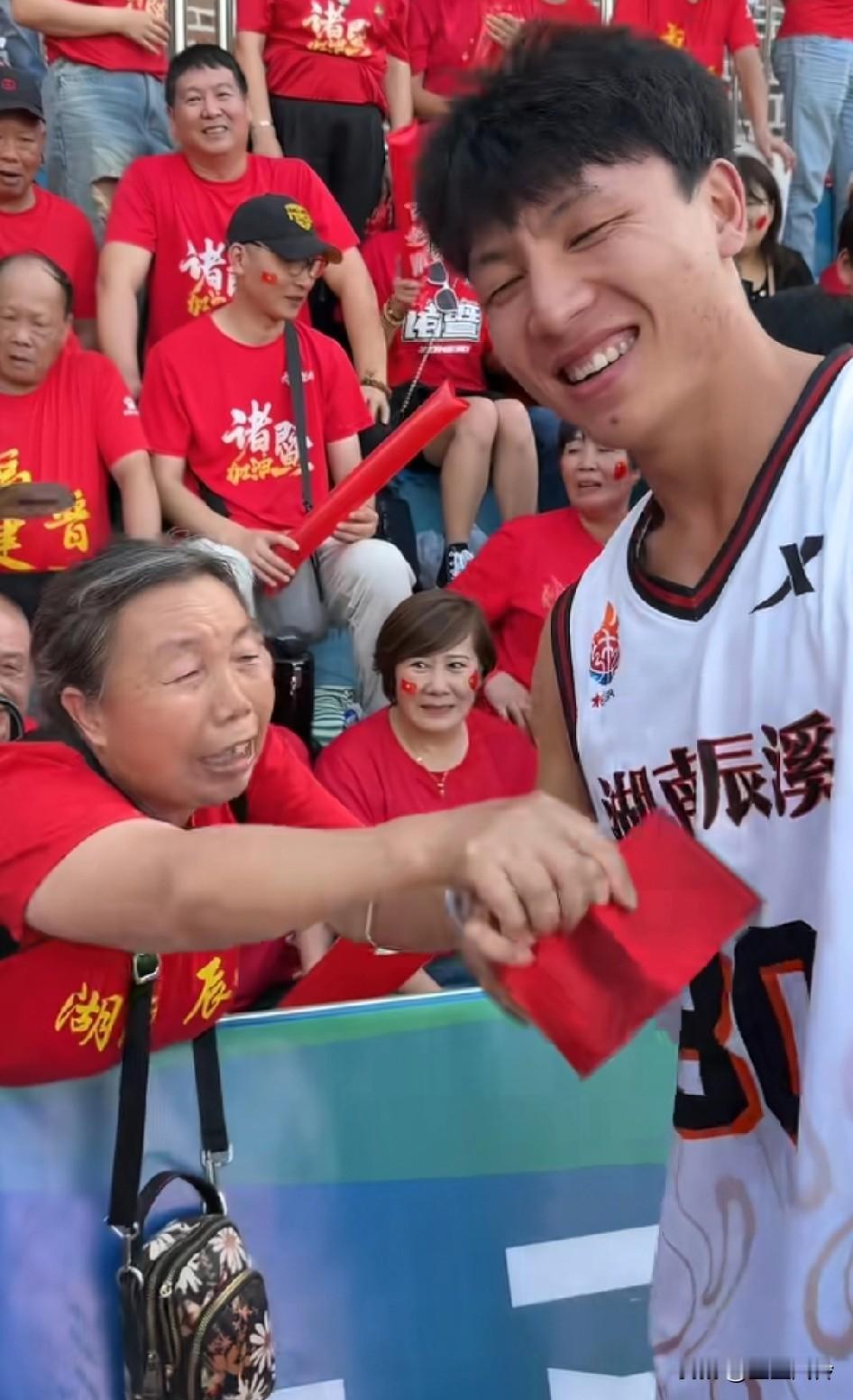 硬塞红包!辰溪啦啦队的阿姨真的很爱他们的球员,在打比赛之前把他喊过来硬核塞红包 钱不在多少,是阿姨的那份爱国心,说不定里面有她女儿的照片和微信哈哈,老奶奶给的红包,不管大小,都是希望你受到鼓励,上阵杀敌,为家乡而战 说实话,没有哪个队的球员有他那种积极的态度,无论落后多少分他都非常的认真。给的是红包,里面装的都是信任,热情,关爱!民意不可违!用行动回报广大父老乡亲! 球迷跟随球队一路走来“-起笑一起哭”,八进四那场球至少有一半人激动得哭了.场上有多拼场下也有多激动,每进一球都喜得跳起来鼓掌,这就是辰溪球迷