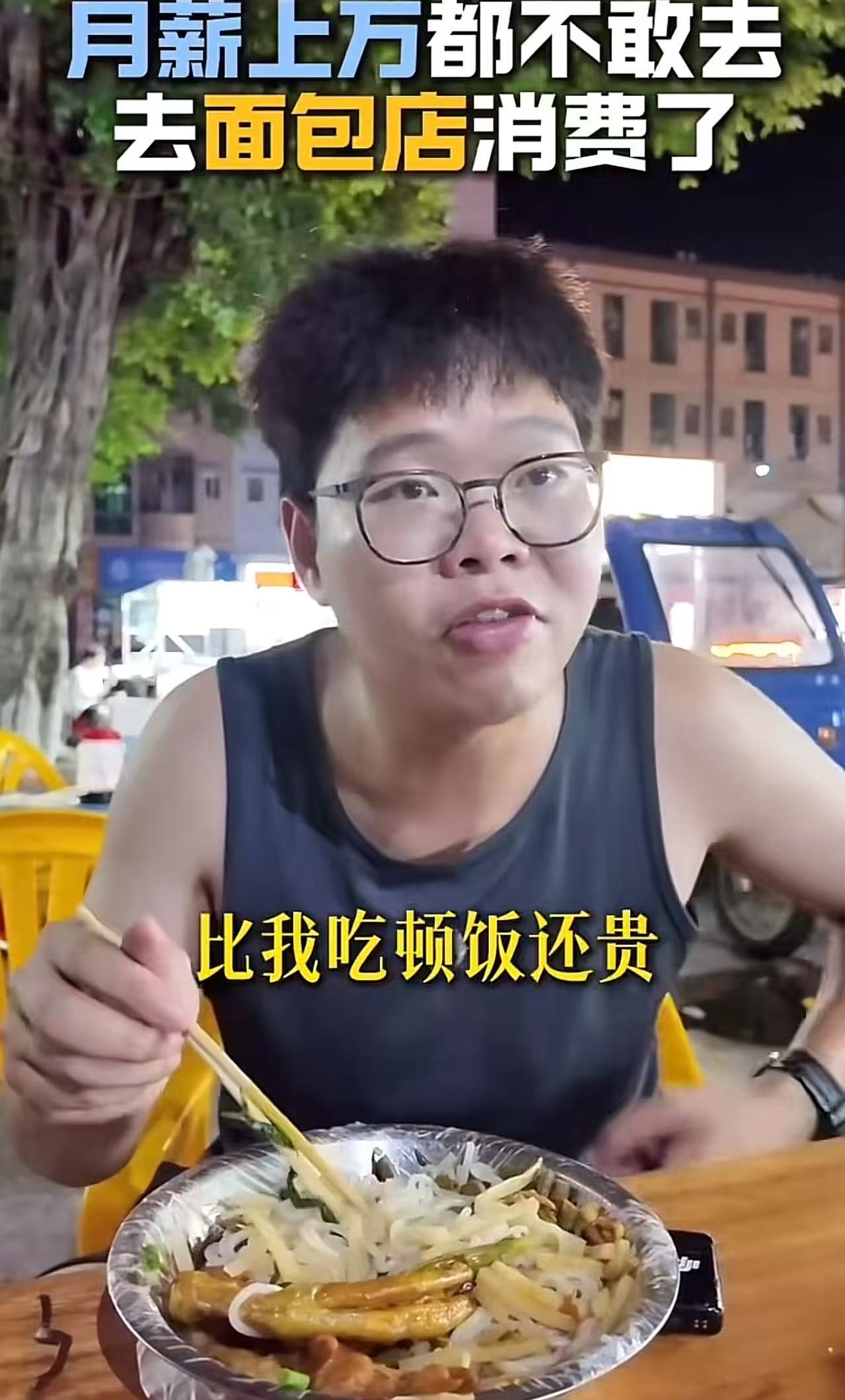 这位男生一脸无奈地说:“在沈阳的时候,面包大得跟小脸盆似的,一个才卖3块5,这才是正常价格嘛。可到了南方,在一些高档小区楼下的面包店,一个蛋挞,就那么丁点儿大,一口下去就没了,根本吃不饱,居然要卖6块钱。还有那面包,价格贵得离谱,比我吃顿饭还贵。就说今晚吧,我吃的螺蛳粉才十几块钱,可我去面包店随便买点东西,就五六十块钱没了。”