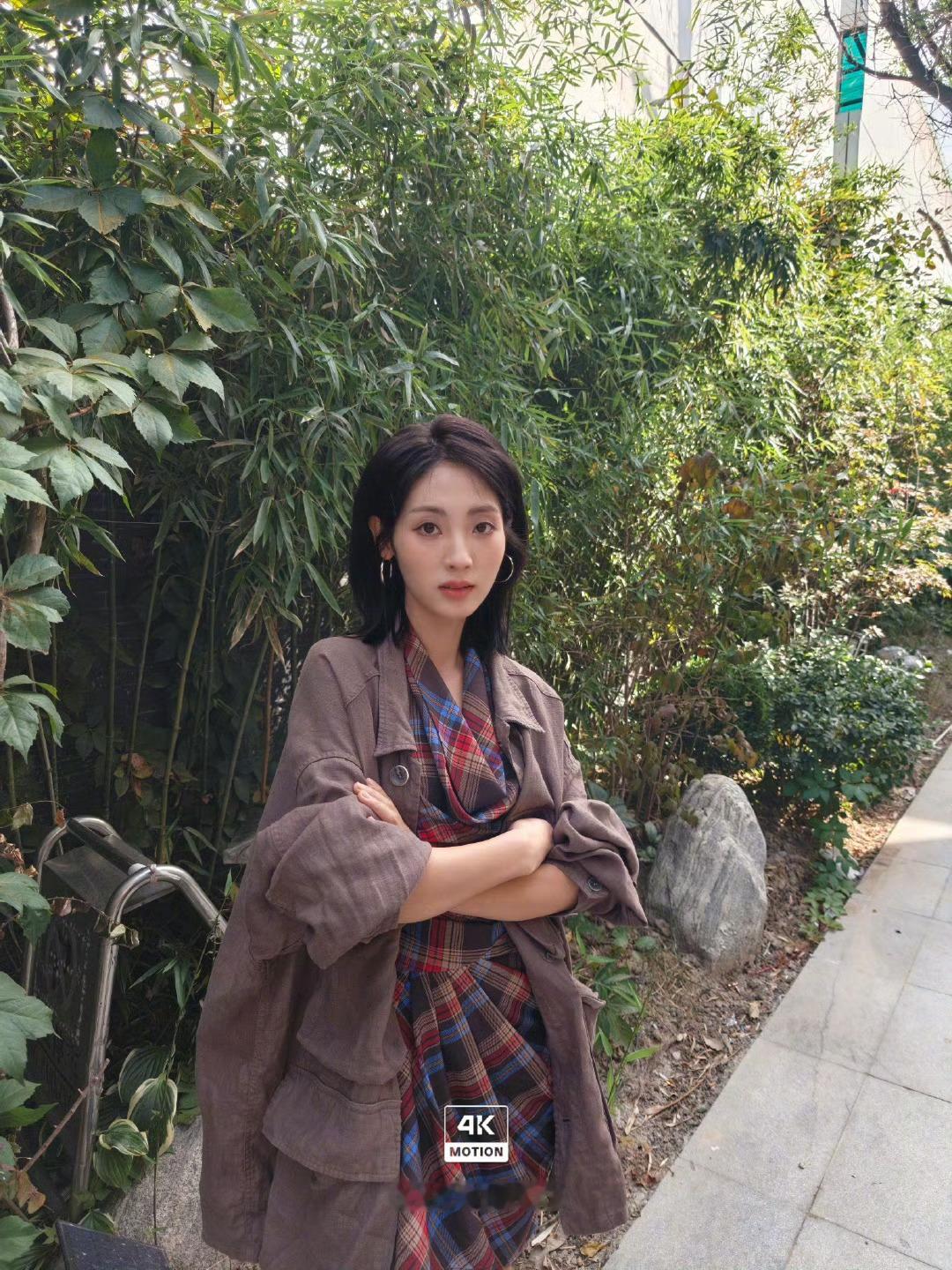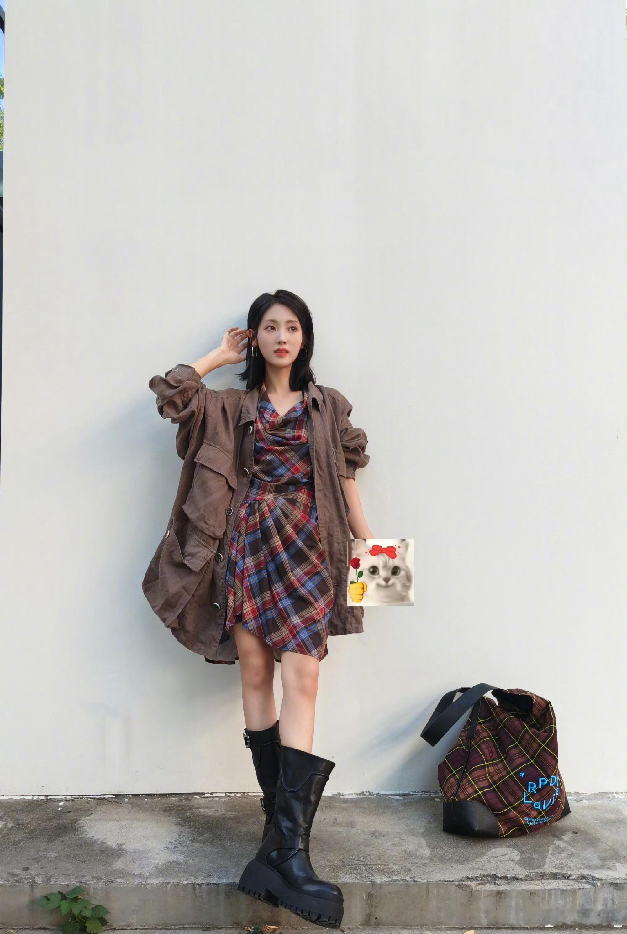 邢菲宝棕调外套配格纹裙,像刚出炉的焦糖甜点,甜酷又撩人,秋日氛围感直接腌入味~