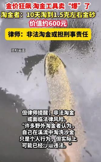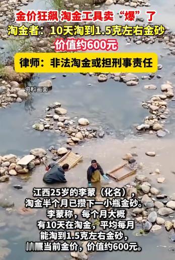 江西,一伙子发现最近金价飞涨,于是买了淘金工具,时不时去溪边碰碰运气,谁知还真给他淘到一些。而和小伙子抱有同样想法的人还挺多,这导致网上淘金工具都给卖爆了。可他们不知道的是,这看似充满机遇的淘金行动,实则暗藏风险。 清晨五点半的江西山涧,薄雾还没散尽,溪水带着山间的凉意,刚没过脚踝就透着刺骨的冷。 25岁的李蒙已经蹲在溪边,双手攥着个直径约50厘米的塑料淘金盘,从河床里一捧捧舀起混着沙石的泥水。 他手腕轻轻晃动,浑浊的水流顺着盘沿淌走,留下的细沙里,偶尔能看到针尖大的金黄颗粒。 这是他半个月来的“宝贝”,攒在小玻璃瓶里,凑够0.5克就能卖几百块钱,抵得上他之前在工地干一天的工钱。 这一切的源头,是今年一路飙升的金价。 金价这么高,闲着也是闲着,来溪边碰碰运气,说不定能多赚点。 李蒙的想法,成了不少江西人的共识,原本冷清的溪涧,渐渐挤满了像他这样的淘金者。 最开始,李蒙只是周末骑摩托车来试试,后来看到金砂能换真金白银,干脆辞了工地的活,把淘金当成了主业。 每天从清晨忙到傍晚,水里泡久了,膝盖总隐隐作痛,腰也酸得直不起来,但他总盼着“下一勺就能多淘点”。 和他一起的还有十几个人,大家自发分了工:力气大的汉子在下游挖沙,眼尖的妇女蹲在石头上筛选粗砂。 最后几道淘洗的细活,都交给像李蒙这样“有点经验”的人。 他们的技术大多是从短视频上学的,刷到“淘金教程”就跟着练,再从网上买个淘金盘、塑料铲,几十块钱就能“入行”。 淘金的人多了,网上的工具店先火了。 打开购物软件搜“淘金盘”,不少店铺的月销量都破了千,金属探测器更是成了抢手货。 河北有家做淘金工具的厂子,客服说从今年三四月份开始,每天能接到上百个订单,千元左右的入门款卖得最好,买家里十有八九是江西、湖南的。 甚至有商家打出“淘金包邮”“金子等你挖”的广告,评论区里全是问“新手怎么入门”“哪里能淘到金”的人,仿佛淘金成了一门“低门槛高回报”的生意。 可这看似能“赚快钱”的事,藏着不少坑。 他见过不少人兴冲冲来,带着空瓶子走,有人甚至连金砂长什么样都没见过,白忙活一场。 比赚不到钱更可怕的,是看不见的法律风险。 律师项鸿告诉记者,黄金可不是“谁挖到就是谁的”,它属于国家规定的“保护性开采矿种”。 不管是溪里的金砂还是地下的金矿,都归国家所有。 根据《矿产资源法》,没拿到采矿许可证就私自淘金,就算违法,不仅工具会被没收,还要罚钱。 如果淘到的金砂值1000块,可能要罚3000到5000块,要是没淘到多少,也可能面临10万到100万的罚款。 更严重的是,要是淘到的金砂价值超过10万,还可能触犯《刑法》里的非法采矿罪,最高要判7年有期徒刑。 很多淘金者都觉得“就淘点沙子玩一玩,赚点小钱不算犯法”,可事实并非如此。 不是说‘量少就没事’,关键是有没有合法资质。 哪怕只淘到几克,只要没许可证,本质上都是违法的。 除了法律风险,淘金还在悄悄破坏溪流生态。 不少人为了挖深点的泥沙,直接用铲子刨河床,原本清澈的溪水变得浑浊,岸边的草皮也被踩得稀烂。 当地环保站的工作人员说,长期这么挖,会导致河床松动,泥沙淤积堵塞河道,溪里的鱼虾也会受影响。 这场淘金热,说到底是“贪小便宜”的心理在作祟,总觉得“说不定能暴富”,却没算清违法、亏本、毁生态的账。 其实哪有什么“低门槛暴富”的好事?那些买工具的钱、来回奔波的时间,要是用在正经工作上,也早有稳定回报了。 真正的“财富”从来不是靠“碰运气”来的,而是靠脚踏实地的努力,靠守护好身边的绿水青山,靠守住法律和道德的红线。 希望这股淘金热能早点冷却,让江西的溪流恢复清澈,也让更多人明白:贪小便宜终究要吃大亏,只有守住生态与法治的底线,才能拥有真正安稳的生活。 信息来源:杭州网2025-10-15发布视频
