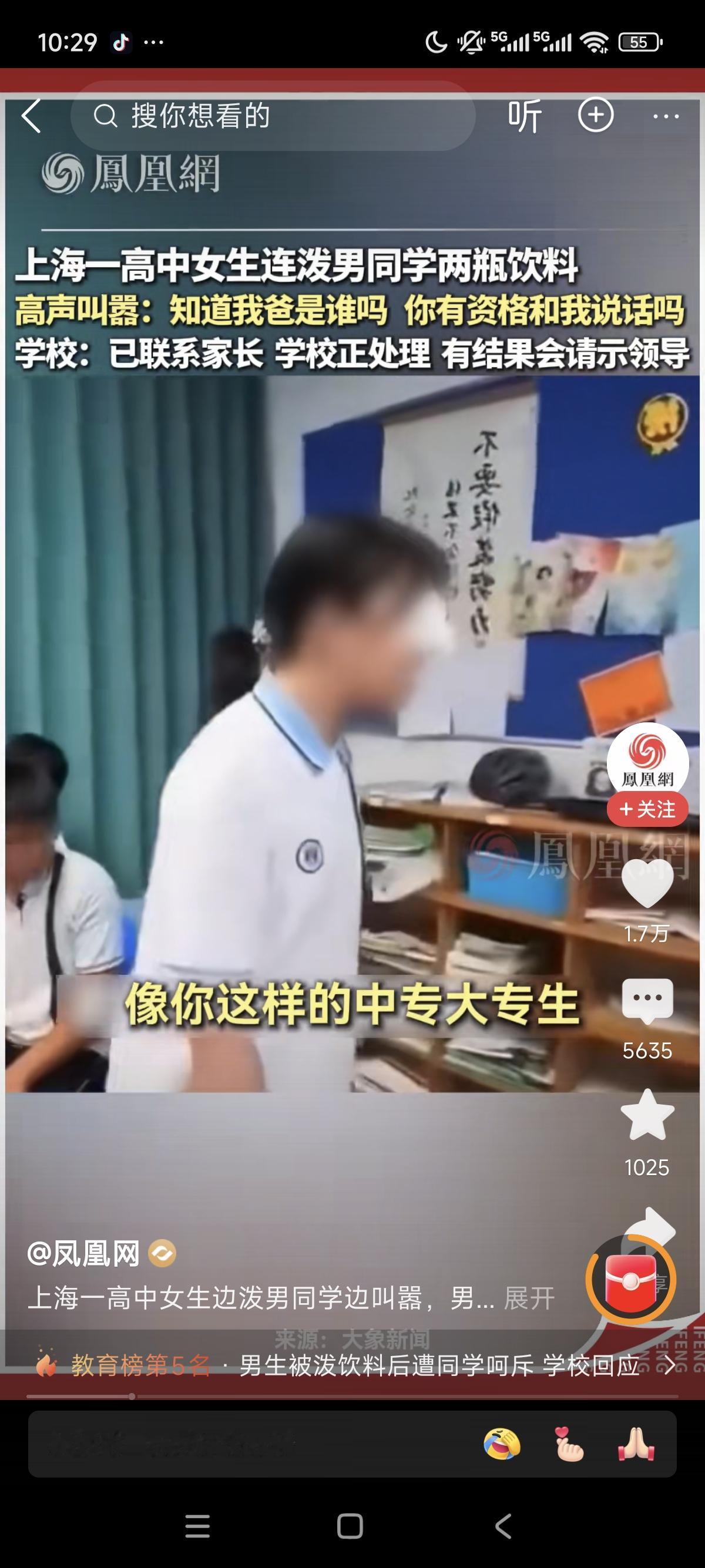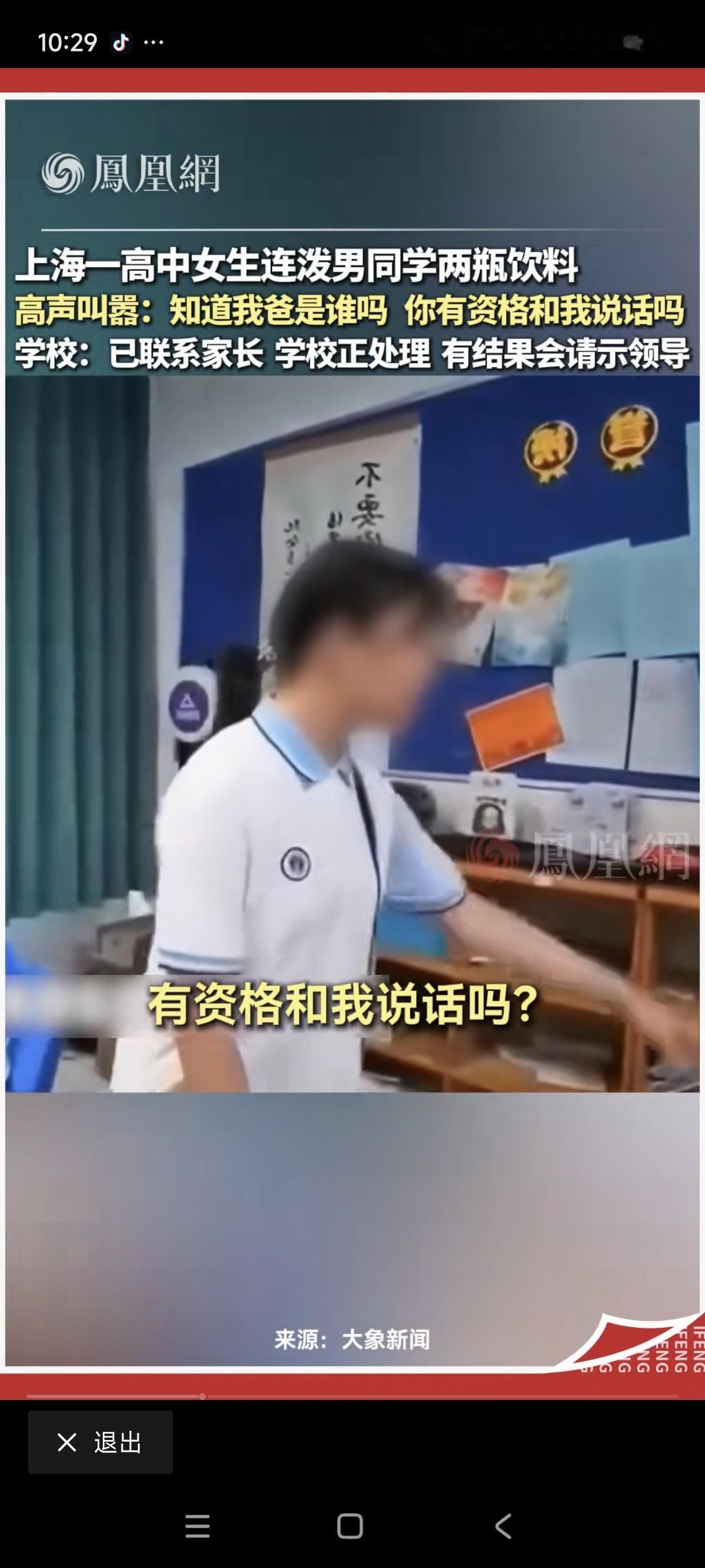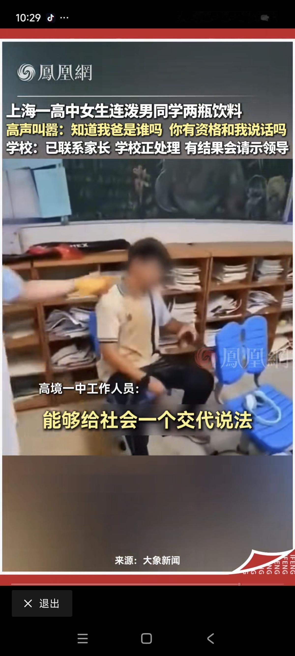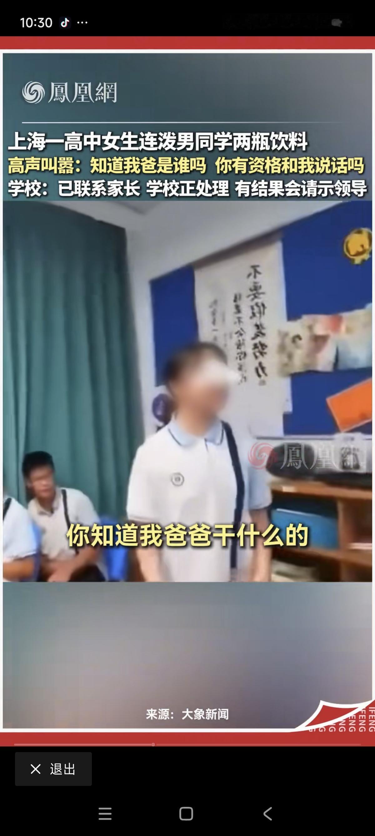 上海一中学又出现了严重霸凌事件, 从这件霸凌事件可以看出来,这女孩子家世不一般。她霸凌男同学的时候,旁边竟然没有一个同学敢来插手。倒是这个男孩子还手自卫的时候,来了一群男生把男孩子给压在了地上,看似在劝架,实际上都是帮女施暴者! 这个女同学一直叫嚣,你知道我爸是谁吗?就凭你这样的人也有资格跟我说话吗?你以后就是读大专的料!连续破了两瓶可乐,男孩子都无动于衷,不敢还手! 最后被她侮辱性的言语激怒才出手制止。最后到底会怎么判罚呢?大家说说看?她爸到底是谁呀?最后这位男同学会不会被学校开除了?