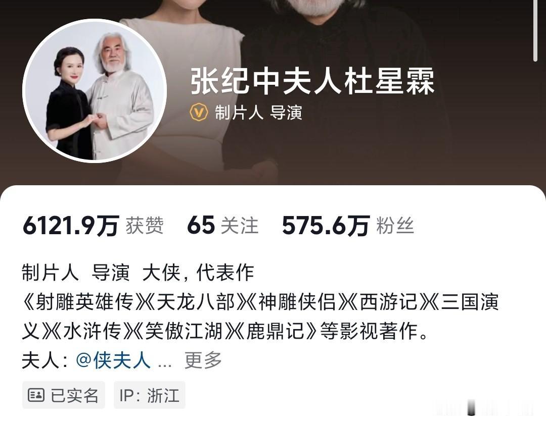 名字改了,认证没改,介绍没改,杜星霖女士应该意识到了自己此前的行为,没能把自己塑造成为一个女侠,反倒是让大众会认为她七十四岁的老公是个莽夫。 所以她开始怕了改名字的这个举动,其实就是她怕了的铁证,担心骂街的这种行为会让他们两口子都没法在网络上混了。 所以他想到了改名字,把原来的张纪忠、杜星霖夫妇改成了张纪中夫人杜星霖。 就是向世界宣布骂街的这种行为,对网友的这种行为是我杜星霖干的,一人做事,一人当跟我老公没关系。 我倒是觉得这是可能还真的跟张纪中没有多少关系,一个从助理摇身一变,成为亿万富翁,导演夫人的女人极短的时间里实现了阶层的跨越,所以她的那种优越感以及打心底瞧不起普通网友的那个心态,确实会让她错误的认为自己在网络上撒泼会吓到网友,但几天时间的舆论发酵,让她有些认清了,现实,网络上竟然没有人怕,他更没人惯着他,眼看现在没法收场了,所以她把名字给改了,这样起码还能给他们一家子留一个在网络上吃饭的机会。 但是我想提醒一下杜女士,你要改就改的彻底一点,一边着急忙慌的辩解,我不是公众人物,一边还挂着制片人导演这样的身份,你这是把平台的认证当儿戏,个人介绍里代表作写的是《射雕英雄传》《天龙八部》《神雕侠侣》,这就更不合适了,这些剧并不是你导演的。