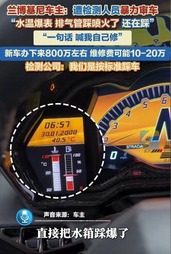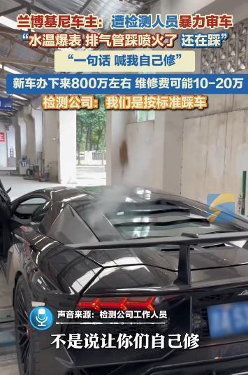 这叫什么事!四川成都,男子800多万豪车送去年审,没想到检测人员一顿“测试”之后,水箱被直接踩爆,维修费超过10万元,检测公司却回复:“我们是按照标准踩车,你可以去鉴定!” 10月15日下午,成都某机动车检测站的院子里,张先生抽着烟来回踱步,目光死死盯着紧闭的检测车间大门。 他花800万买下的兰博基尼“大牛”正在里面做年检。 可没过多久,一阵刺耳的金属异响混着浓烟从门缝里钻出来,紧接着就是“嘣”的一声巨响,让他的心瞬间揪紧。 冲进去时,眼前的景象让张先生动弹不得。 爱车的发动机舱正冒着白烟,防冻液顺着地面流成蜿蜒的小溪,水温表指针死死钉在130℃的红线外,水箱外壳已经裂开一道狰狞的口子。 而操作位上的检测员,正慢悠悠地解开安全带,仿佛刚才把油门踩到底的不是他。 这已经不是检测过程中第一次出现异常。 据张先生回忆,下午4点半检测开始后,他多次要求进入车间查看都被拒绝。 透过车间的观察窗,他清楚地看到排气管先后喷出三四次半米长的火苗,旁边的气泵设备还发出过刺耳的故障报警。 可检测员只是瞥了一眼警报灯,脚底下的油门非但没松,反而踩得更狠了。 张先生称,车开过来的时候一点毛病没有,故障灯一个都没亮,才保养完不到一个月,声音里满是心疼。 他指着破损的水箱说,4S店初步估算,光是更换原厂水箱和检修发动机的费用就超过10万,要是缸体因为高温变形,20万都打不住。 更让他气不过的是检测公司的态度,对方坚称“完全按标准操作”,甩下一句“不服就去鉴定”便不再理会,甚至暗示是车辆本身存在隐患。 大家花钱年检,是想让专业人士排查安全隐患,而不是花钱买新故障。 检测站那句轻飘飘的“按标准操作”,不该成为逃避责任的借口;“去鉴定”更不能成为甩给车主的包袱。 如今张先生已经保留了检测视频和报警记录,准备通过法律途径维权。 而这起事件也该给整个年检行业敲个警钟:那些被无视的警报声、被踩爆的转速表,考验的不仅是检测员的职业素养,更是年检制度的公信力。 年检的本质,本是为道路安全把关、为车主权益护航。 只有让检测标准真正落地,让责任追究不再缺位,才能从根本上杜绝“检测变毁车”的闹剧。 毕竟车主花的是检车费,不是“毁车费”,从“形式化流程”回归“安全保障本质”,才能让年检真正成为车主的“安全屏障”,而非“车辆破坏风险点”。 信息来源:闪电新闻2025-10-17发布视频