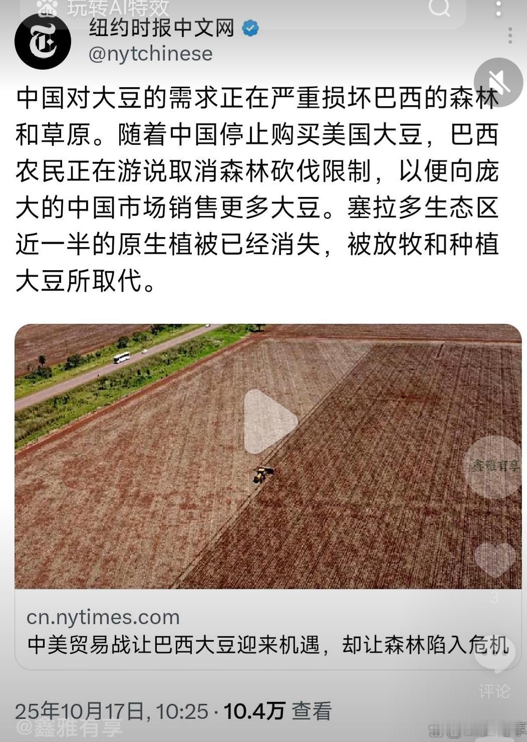 美媒:中美贸易战让巴西大豆迎来机遇,却让森林陷入危机。 美国纽约时报中文网10