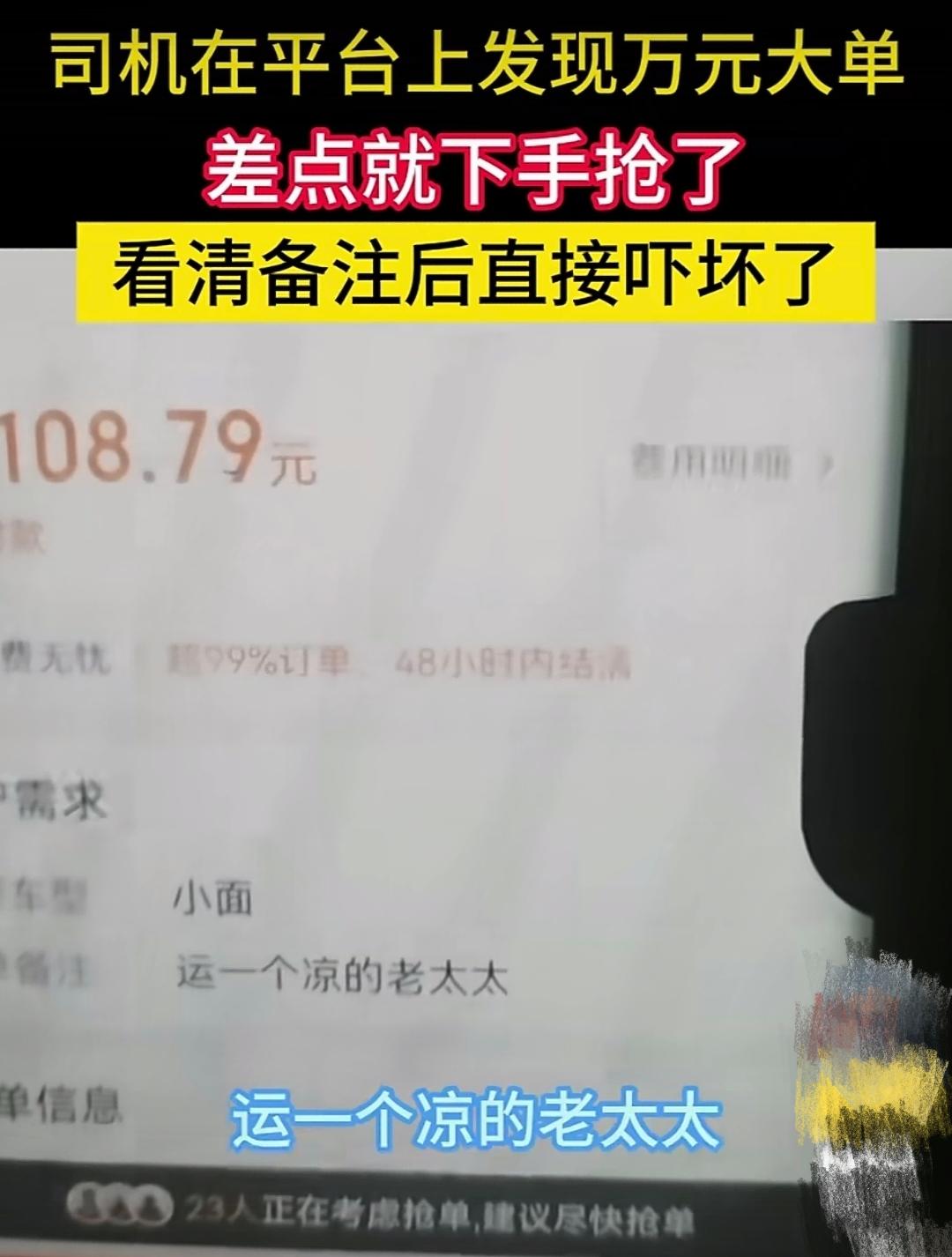 男子大晚上坐在车里等着抢单,突然,平台上惊现“万元大单”! 正当他兴奋想下手抢单时,仔细一看备注“送一个凉了的老太太”,男子魂都吓飞了! 我的天!运一个凉了的老太太,短短的一句话,像一盆冰水从男子头顶浇个透心凉,刚才抢单的兴奋劲瞬间化为乌有。 这哪是运人,这分明是……他不敢再想下去,赶紧退出了订单页面。 有网友说,司机胆子太小,泼天的富贵都接不住。也有人说大晚上拉一个“特殊乘客”,多多少少都会有心理阴影。 那么,如果你是这个司机,你敢接这单吗?