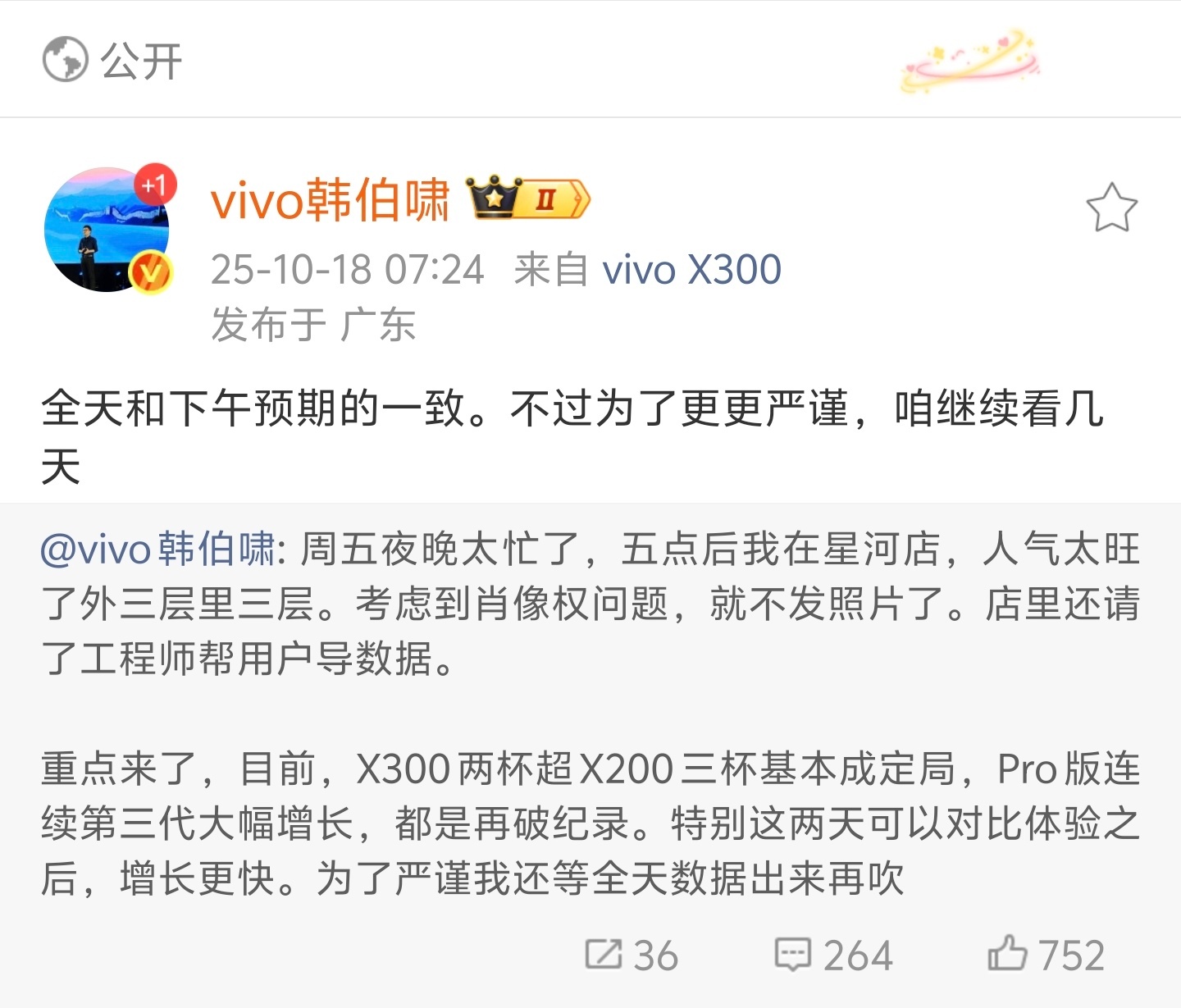 X300系列销量看来是超预期了,vivo韩伯啸透露X300两杯超X200三杯基本