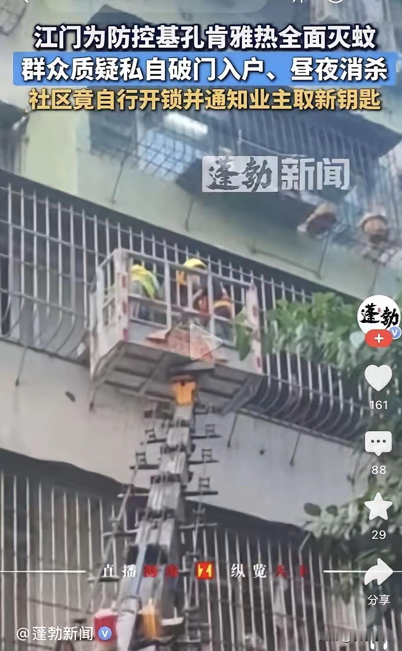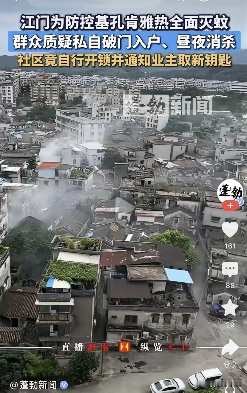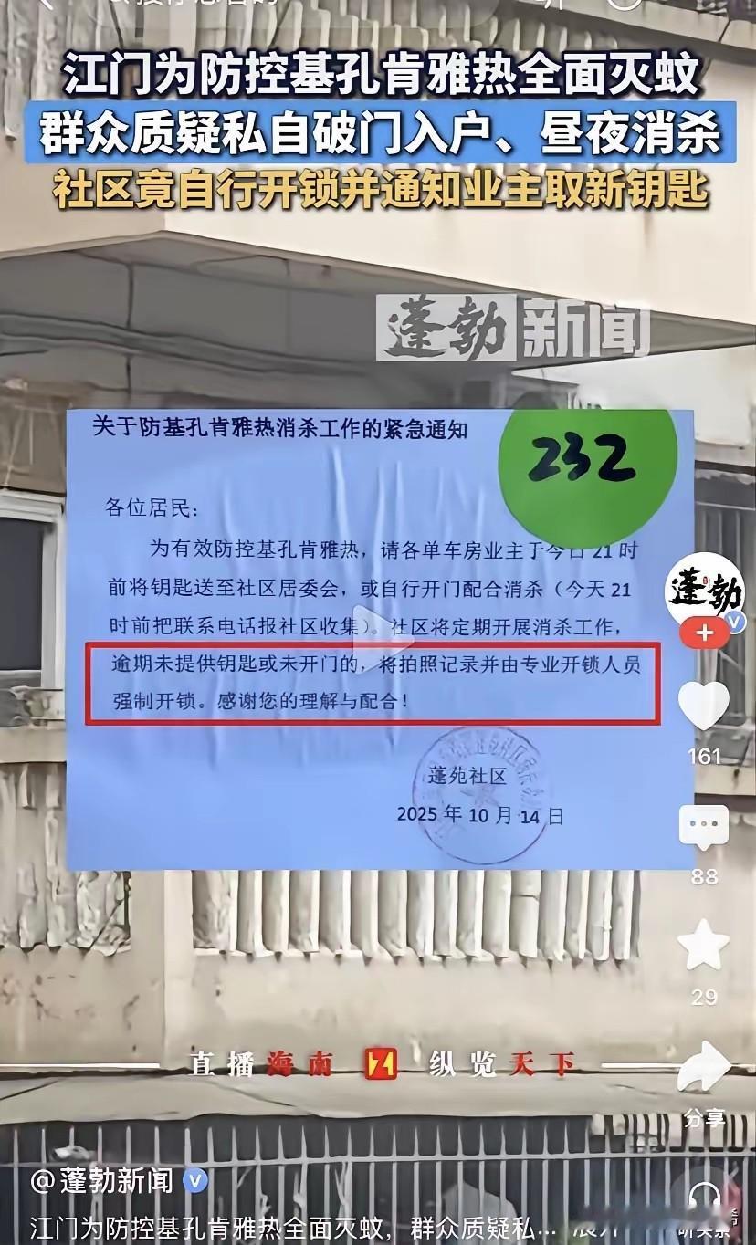江门这边闹基孔肯雅热,本是该齐心防蚊的事,可当地有些做法实在让人看不懂,甚至觉得离谱——没跟群众提前商量、没经过允许,就直接破门进家灭蚊。后来听说还让居民去领新钥匙,这明摆着是把人家门锁都破坏了,不然好好的钥匙哪用换? 说真的,基孔肯雅热虽要防,但这么“硬来”的危害更甚。既伤了群众的信任,也越了办事的边界,防蚊是为了护民,可不能用损害群众权益的方式来做,好好沟通、提前告知,难道就做不到吗?