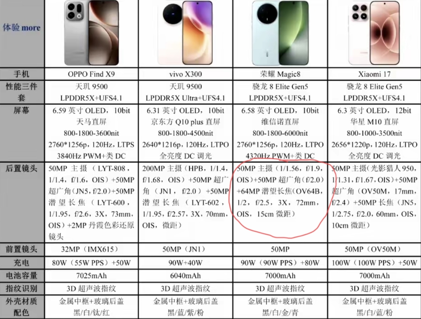 近期四款安卓旗舰新机,看看详细配置就知道哪款适合自己了。我觉得今年安卓旗舰用料都很扎实,无论怎么选都不亏,都是很出色的。我个人比较喜欢荣耀Magic8,主要是今年荣耀在影像方面升级很大,我比较喜欢拍照,这次荣耀在软硬件上都有提升,尤其是长焦端,拍照现在更清晰了。