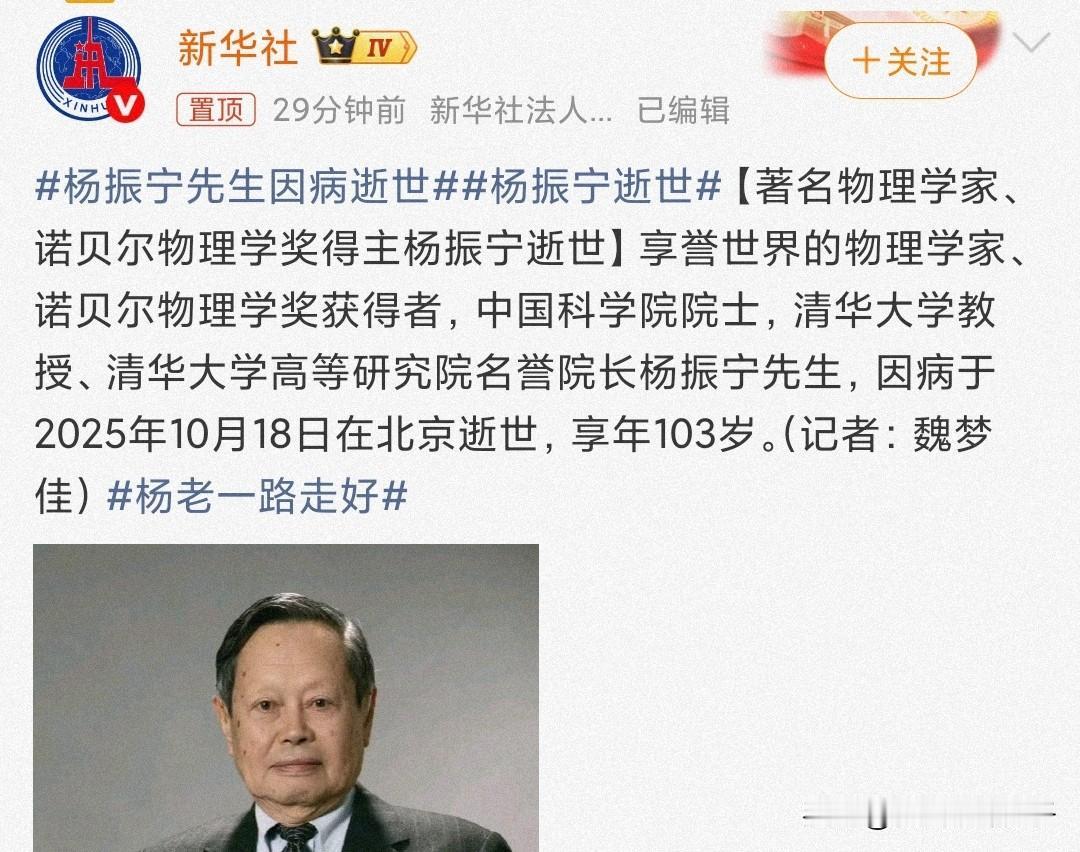 沉痛缅怀!杨振宁老先生逝世,享年103岁…… 10月18日,据媒体报道,杨振宁因病在北京逝世,享年103岁,消息一出,网友纷纷留言悼念:杨老一路走好! 杨老先生的贡献,自然不用多说,一看多重身份,就一目了然了,说实话,用巨星陨落来形容,一点也不过分,这才是值得我们尊敬和关注的人啊! 据悉,这个月初,杨振宁刚过完103岁生日,没想到,就这样永远的离开了。 最伤心的,应该是妻子翁帆吧,两人相濡以沫这么多年,情比金坚,堪称一段佳话,用实际行动打破很多质疑。 愿杨老先生一路走好,天堂没有痛苦!