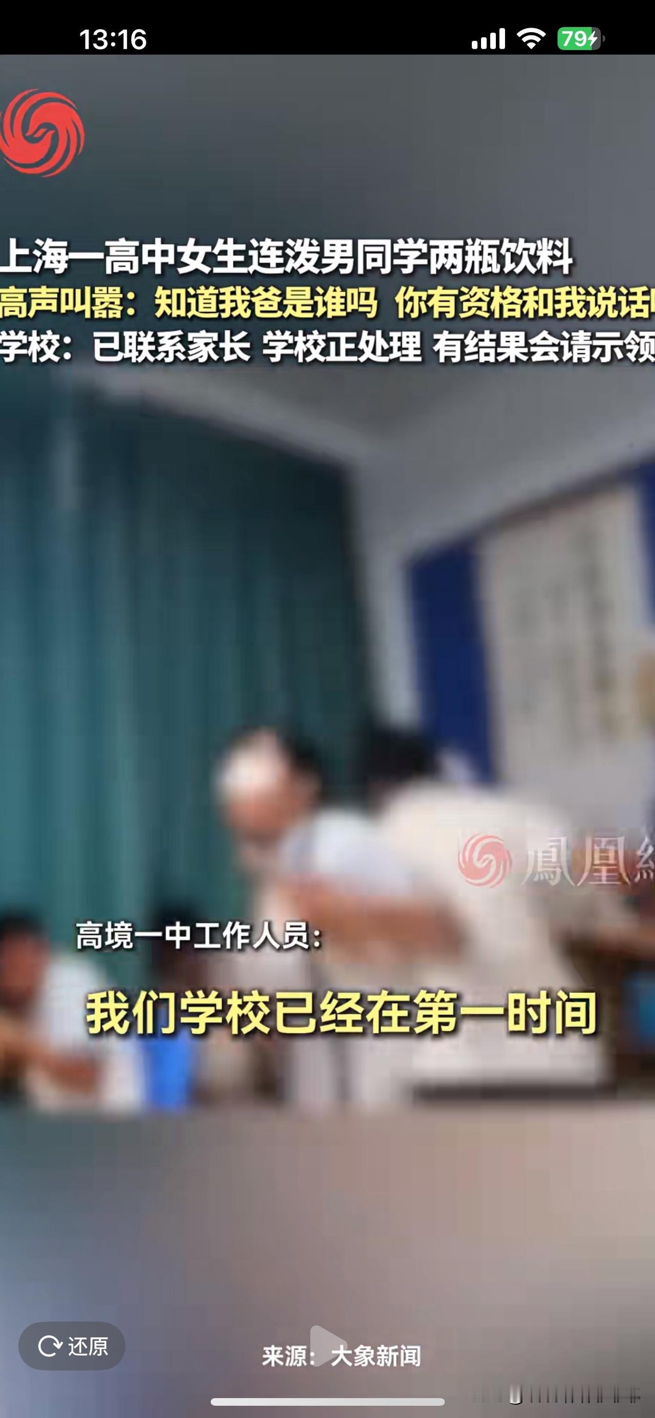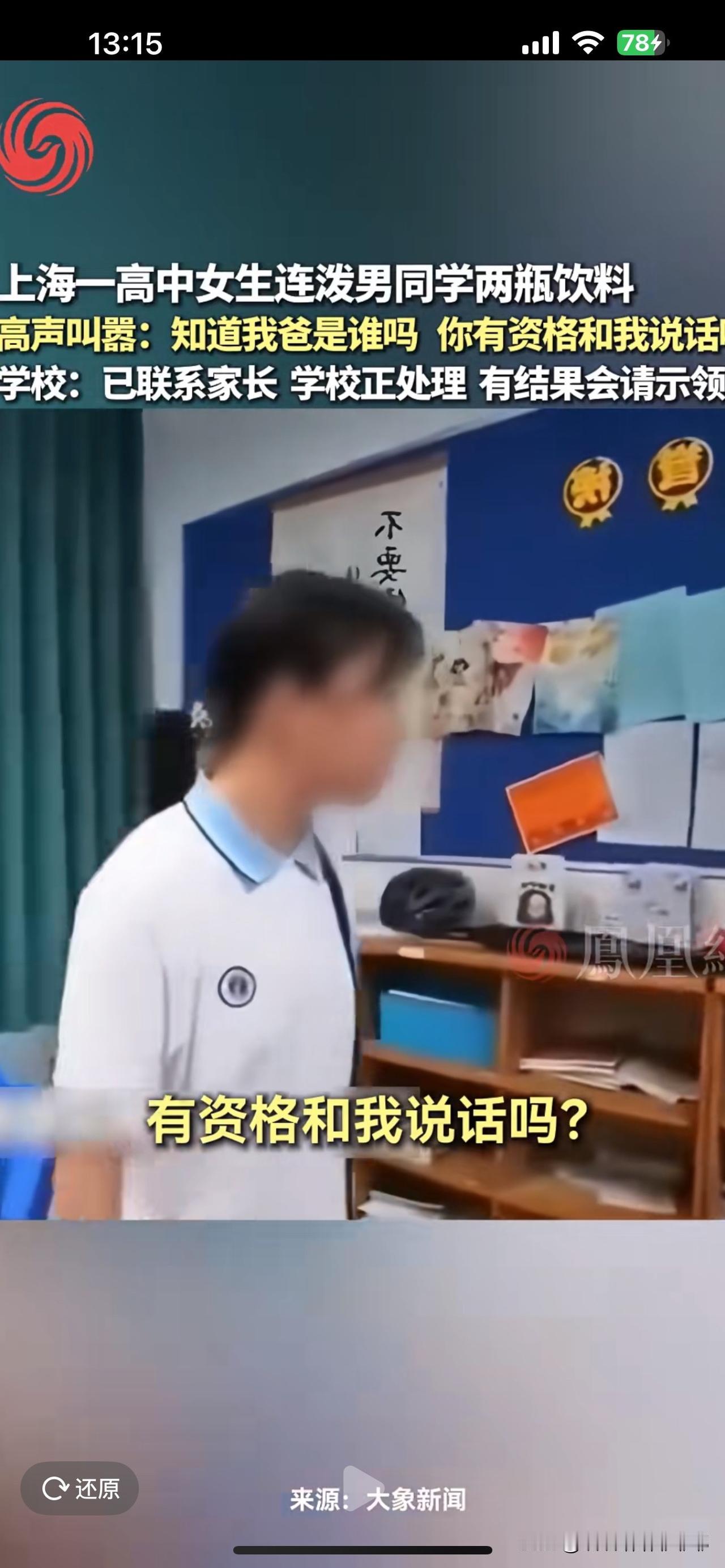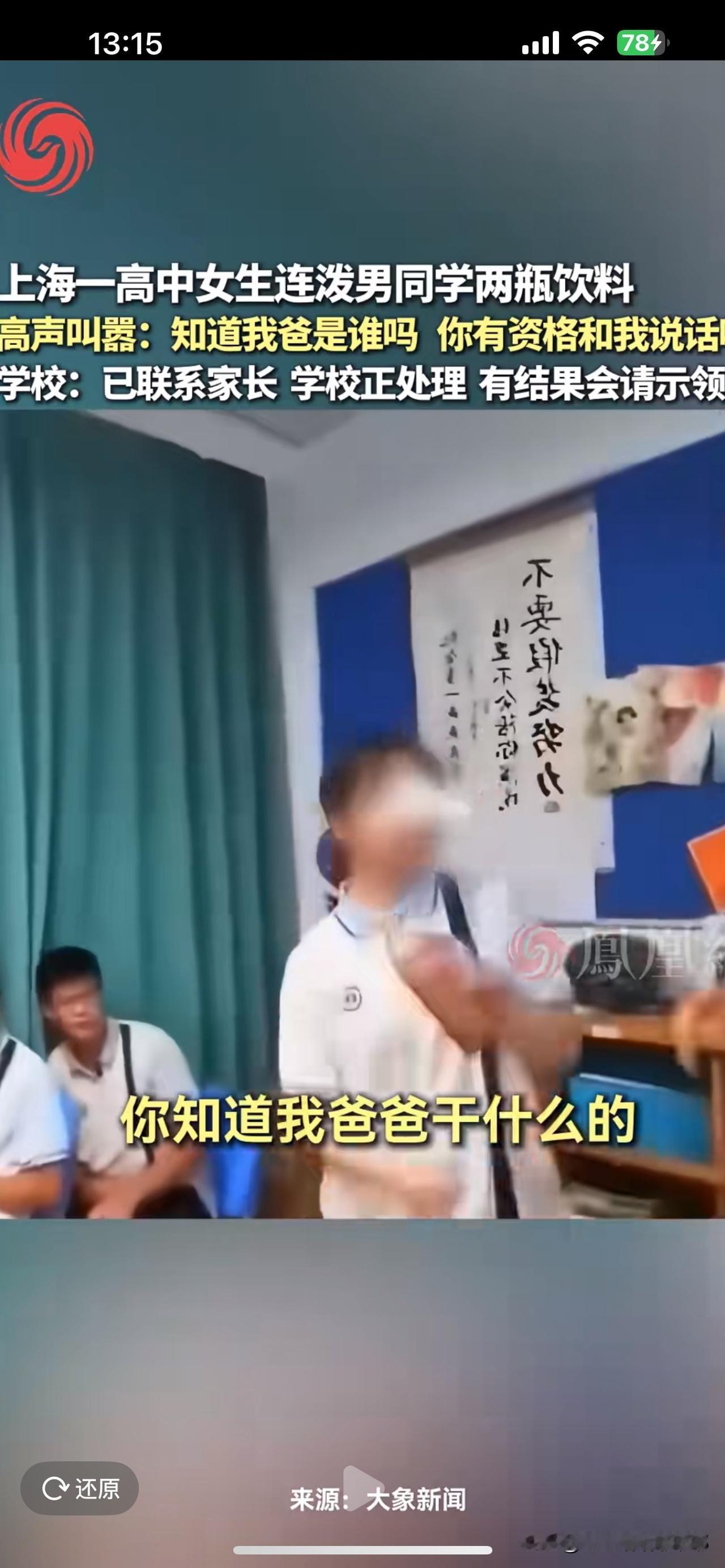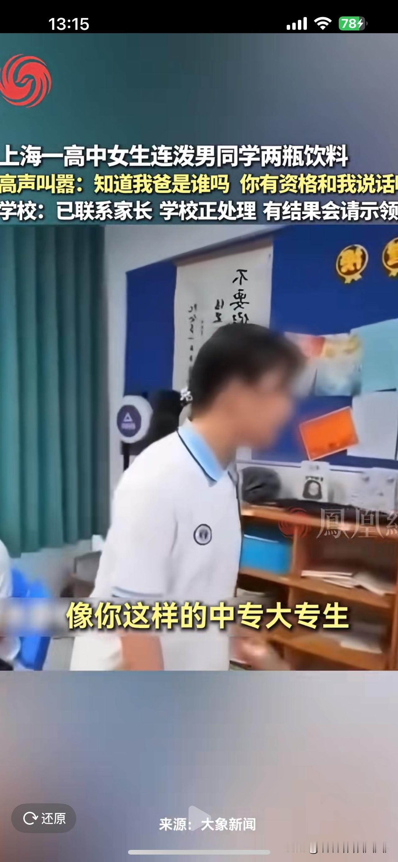 上海一高中女生连泼人家男孩两瓶饮料,嘴里还叫嚣着不知道我爸是干什么的吗?你有资格