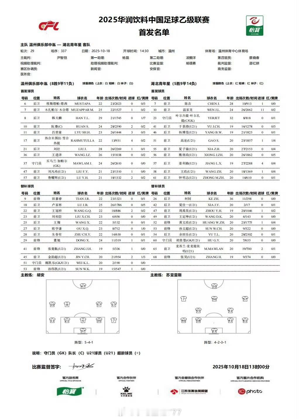 温州队vs湖北青年星双方首发名单