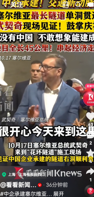 塞尔维亚最长隧道单洞贯通,武契奇现场见证,感谢中国 根据媒体报道10月17日塞尔维亚总统武契奇来到花环隧道施工现场 见证由中国企业承建的隧洞右空顺利贯通,这是塞尔维亚最长的公路隧道建设取得了重要进展 项目建成后穿越国家公园的车程将缩短至5分钟,这是塞尔维亚北部交通新动脉 项目全长45.18公里,诺维萨德-鲁马快速路为未来两地经济发展提供便利