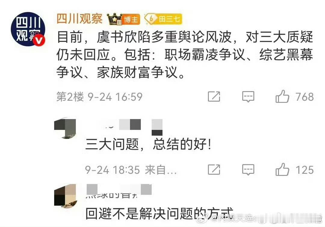 虞书欣 四川观察这是什么意思?为什么要这样评价欣欣呢?[手指比心] 其实我个人觉得某人应该给公众和大众质疑点给个答复不应该舆论那么大当做看不见,躲起来不回应娱乐评论大赏娱乐拌饭[超话]