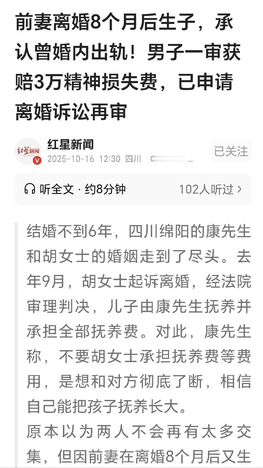 四川绵阳,一男子结婚6年,妻子提出离婚,儿子由男子抚养,男子不要妻子出抚养费,谁知离婚8个月,前妻又要生子,他一算日子,发现没离婚时,前妻已经出軌,男子告到法院,要前妻赔偿他损失费10万,一审判决,前妻赔他30000元,前妻不服,提起上诉,说他动辄殴打辱骂,自己也受到了伤害,男子申请离婚案再审,要求前妻一次付清儿子5~18岁抚养费224800元,并返还离婚时给她的车辆补偿款19000元! 对康先生来说,那份2024年生效的离婚判决,是他苦熬多年后的“结束”,他终于离开了那段让人窒息的婚姻,换来了属于自己的自由。 他在法庭上没有争,也没有吵,只想尽快了结,他主动承担儿子的抚养权,还放弃了向前妻胡女士索要抚养费。 那辆共同买的车判给了他,他反而倒贴给胡女士1.9万元补偿款,康先生心想,只要能平静生活,吃点亏算不了什么。 可他没想到,这场离婚的“体面”背后,竟藏着一个彻头彻尾的骗局,时间回到2023年12月,那时胡女士第一次起诉离婚,态度完全不一样。 她在起诉状里控诉康先生“家暴”,说自己长期受到精神压迫,法院调取监控后发现,所谓的“家暴”其实只是双方在门口的拉扯,并没有动手打人。 即便如此,胡女士仍然坚持要离婚,当时康先生虽然觉得委屈,但为了孩子,也没有太过反驳,只是希望能把矛盾降到最低。 几个月后,胡女士再次提起离婚诉讼,这次她不再提家暴,也不再提抚养费,反而显得特别配合,康先生一度以为,也许她是想放下过去,重新开始。 他没想到,对方的急切不是出于释怀,而是因为肚子里的孩子越来越大,她必须赶在分娩前完成离婚。 就在离婚后,康先生在朋友聚会上无意听到一句话:“你前妻快生了吧?”他愣了几秒,脑子一片空白,朋友还以为他早知道,笑着说孩子估计快满月了。 那一刻,康先生手里的杯子差点掉地上,等他冷静下来一算时间,整个人都僵住了——按怀孕周期推算,受孕时间正好在他们婚姻还没解除的时候。 这意味着,那孩子的父亲,根本不可能是他,康先生越想越气,他回忆起胡女士那段时间的反常——频繁出门打麻将、深夜才回家、手机不离身。 自己白天跑滴滴、晚上兼职,一心想着多赚点钱养家,却被对方背着在外面搞暧昧,后来他还听邻居说,胡女士经常和麻将馆里的一个中年男人走得特别近,这个细节,让他彻底明白了一切。 愤怒之后,他开始收集证据,把胡女士告上法庭,理由是“婚内出轨、重大过错”,他在起诉书中写明,胡女士隐瞒怀孕事实、骗取离婚协议,要求赔偿自己10万元精神损失费。 庭审时,胡女士无法否认,承认确实在婚姻期间和他人有不正当关系,她辩解说,自己之所以会那样,是因为长期受到康先生的冷落和语言侮辱,还声称双方早已名存实亡。 但这些说法没有得到法院认可,法院认定胡女士存在重大过错,一审判决她向康先生赔偿3万元精神损失费。 可康先生并不满意,他认为这点赔偿远不足以弥补自己的伤害,同时,他还发现更大的问题——那份离婚判决的根基被欺骗撼动,他于是以“发现新证据”为由,向法院申请再审,希望推翻原判。 在新的诉求中,康先生完全改变了立场,他要求胡女士从孩子5岁起,每月支付抚养费,直至18岁成年;他还要求胡女士返还自己当初补给她的1.9万元车款,理由是她隐瞒婚内出轨事实,导致原有财产分配严重不公。 案件再次进入审理阶段,法官认为,关于抚养费部分,确实存在重新审查的空间,因为在原判中,康先生是出于“信任”和“误解”才自愿放弃抚养费,如今情况发生重大变化,可以重新评估。 但对于要求一次性支付未来的教育和医疗费用,法院可能不会完全支持,因为那属于未来不确定的支出。 而关于车辆补偿金,是否返还还需进一步查证——重点在于,胡女士的欺骗行为是否直接影响了财产分割的公平性。 信源:红星新闻