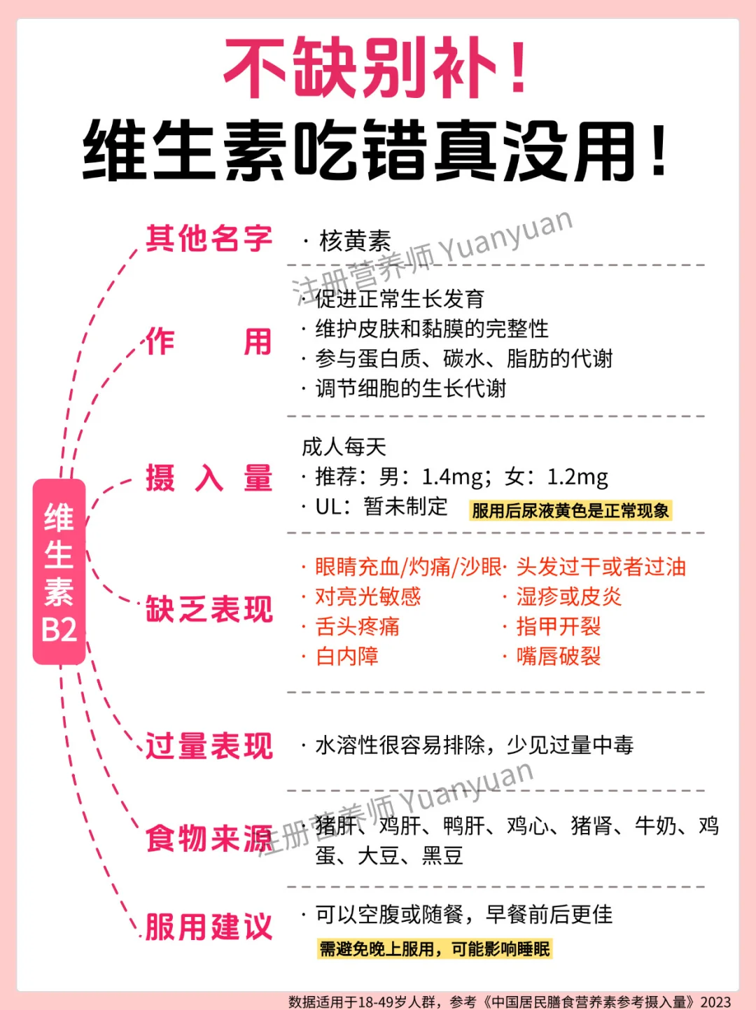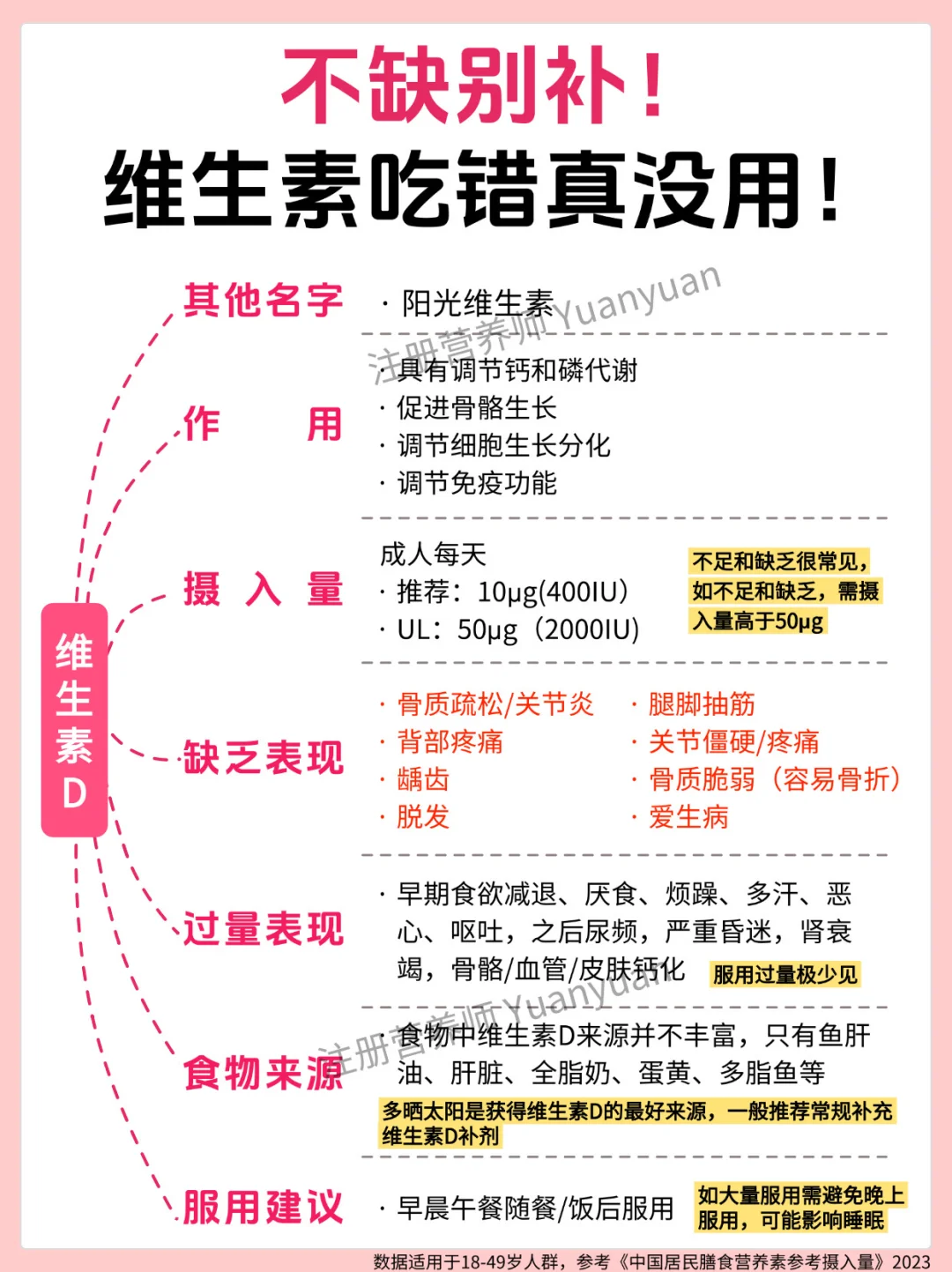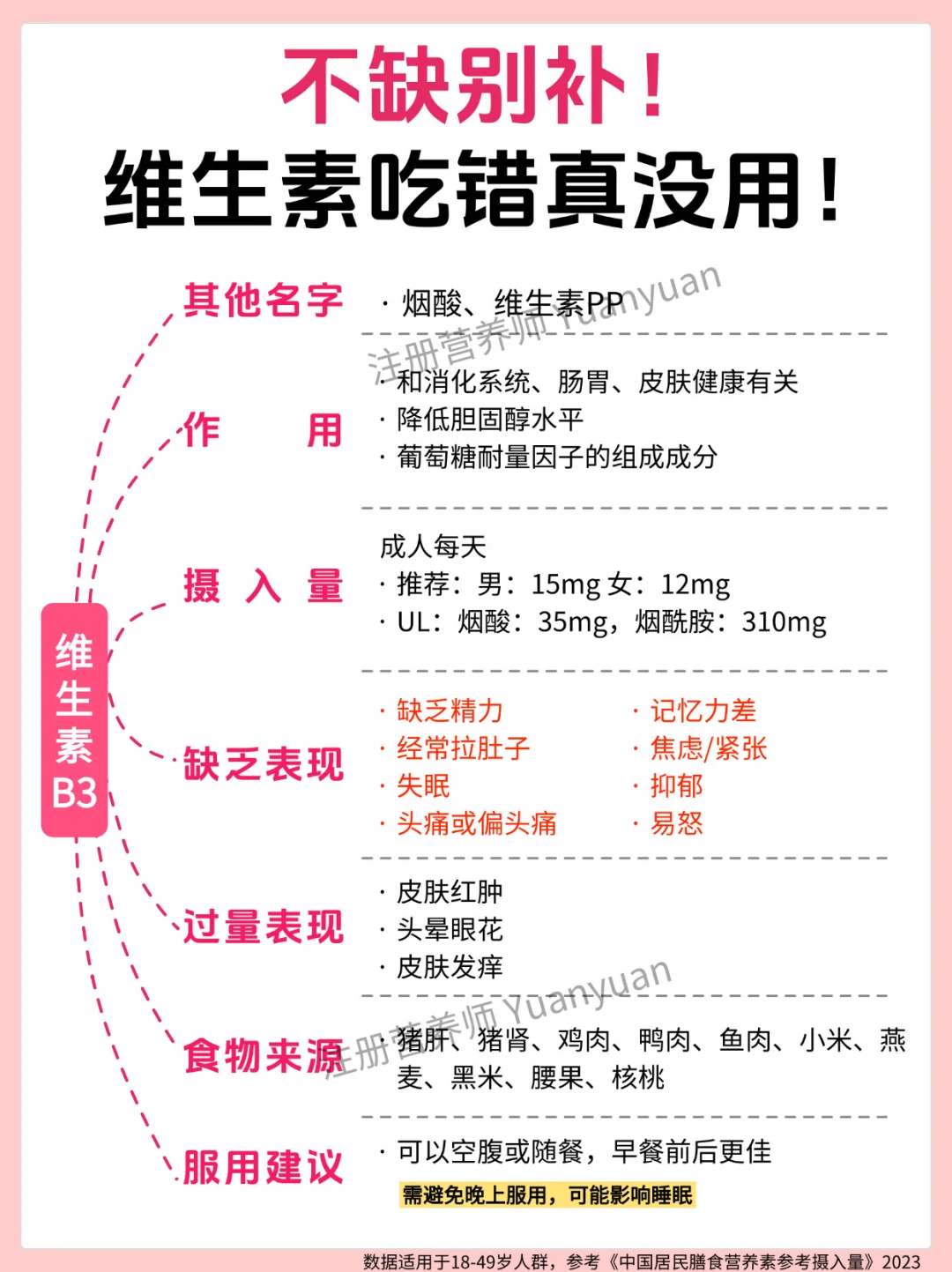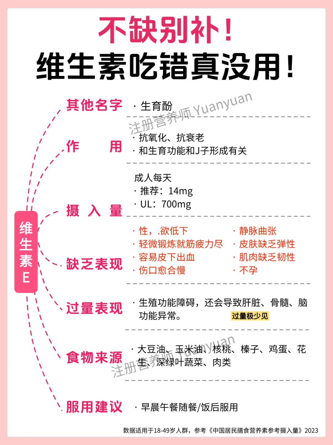 ✅别贪 “多”:过量补充会给身体添负担:很多人觉得 “多吃补得快”,但过量营养素无法被身体吸收,反而会堆积危害健康 —— 尤其是脂溶性维生素(A、D、E、K),多余部分会储存在肝脏和脂肪里,长期大量吃可能导致中毒。18-49 岁人群可参考图 7 的 “可耐受最高摄入量(UL)”。