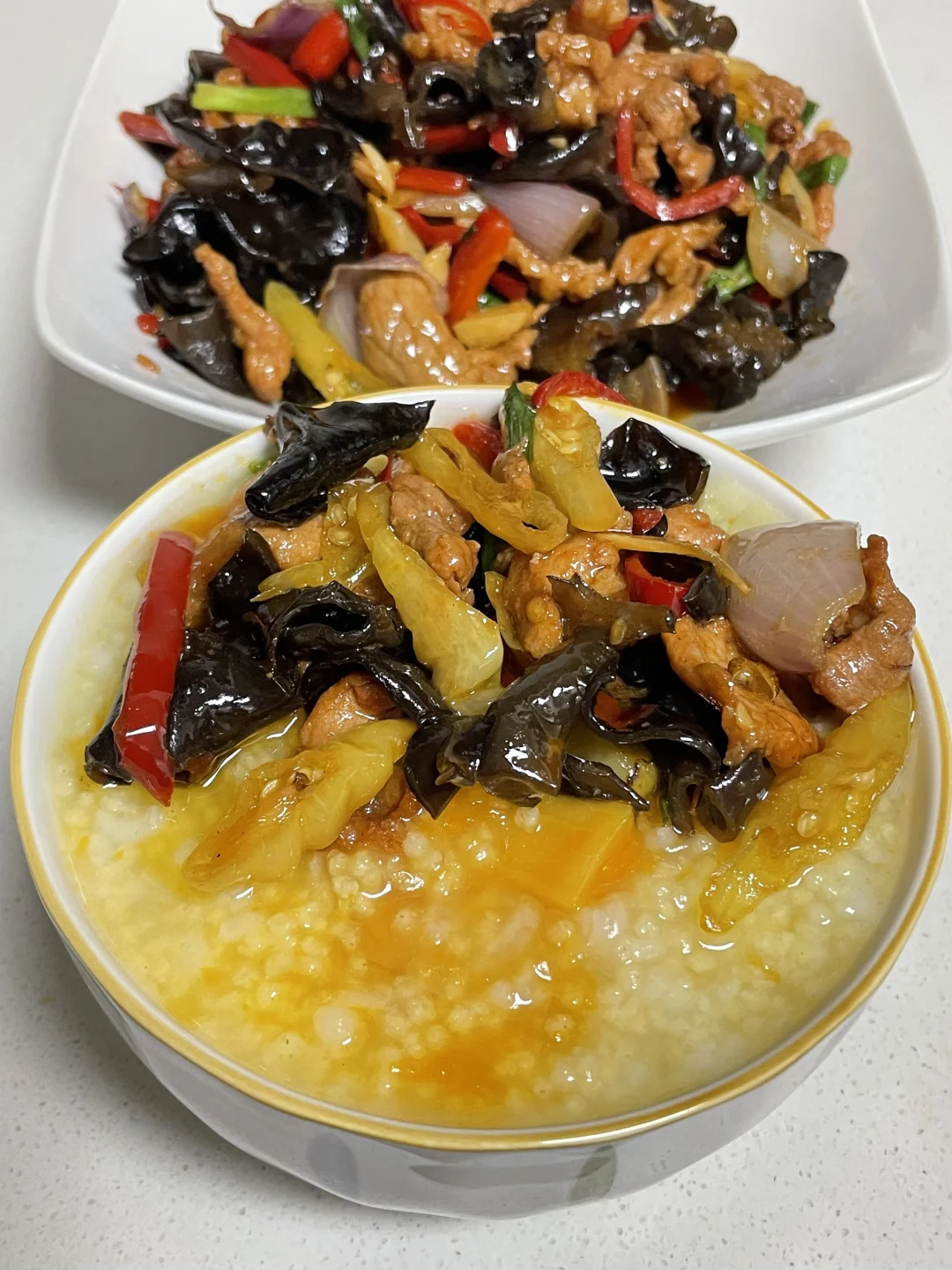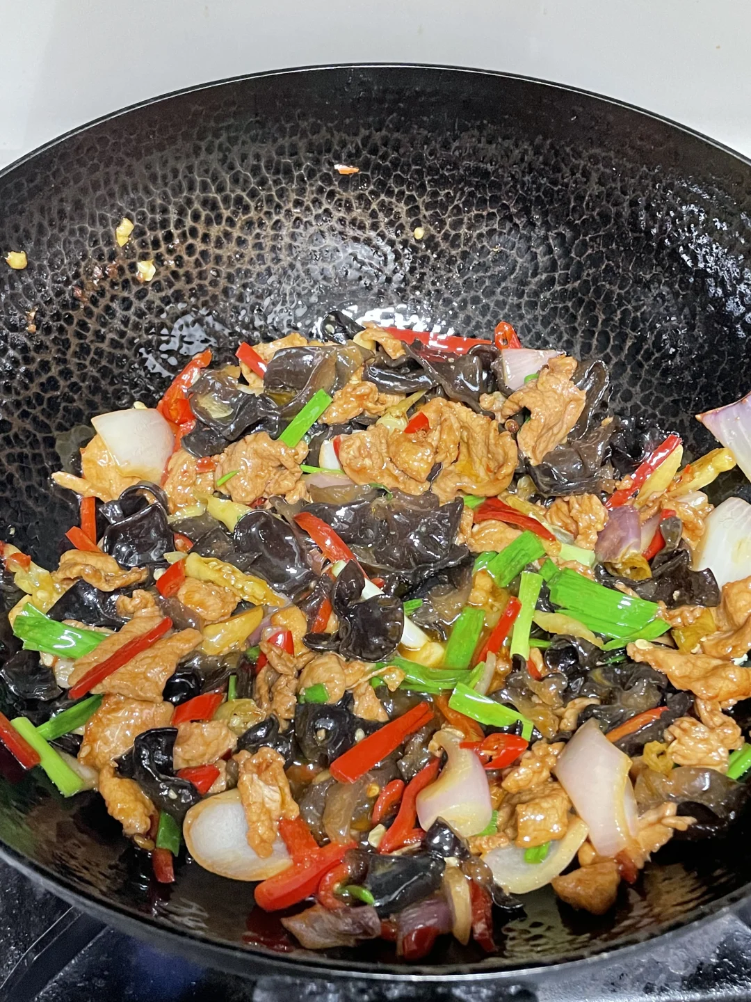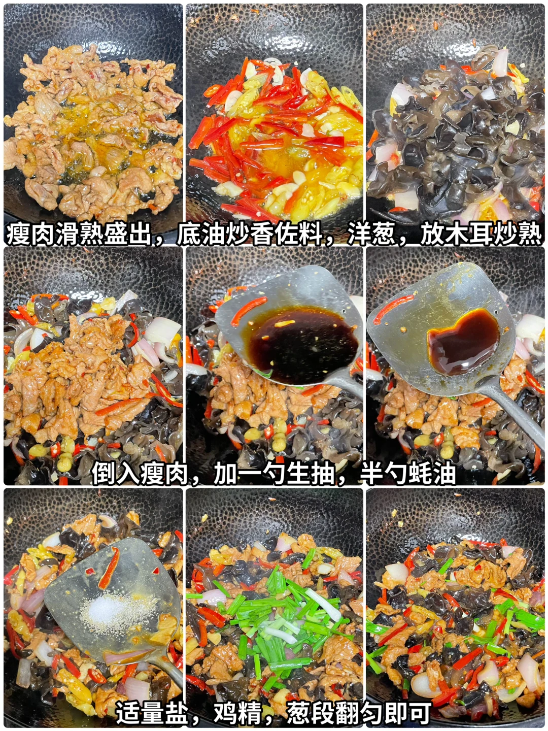 亲爱的姐妹们,周末到了,今天给大家出一个老样子,家常下饭菜。周末不知道做什么的,就可以试一试这个木耳泡椒瘦肉。瘦肉嫩滑,洋葱入味,木耳脆爽[呲牙],再加泡椒的香味,真的巨下饭。喜欢的姐妹可以试一下。 🌶️食材:瘦肉,木耳,泡椒 👩‍🍳做法: 1⃣️瘦肉切片,放入豆瓣。蚝油、生抽、米酒、淀粉、胡椒粉抓匀腌制10分钟备用。 2⃣️木耳洗净,稍微切一下就可以。洋葱切块儿。再准备一些泡椒、红椒、花椒、蒜和一些葱,切成葱段备用。 3⃣️起锅烧油,油热将瘦肉滑熟,盛出底油,炒香红椒、花椒、泡椒和蒜,再加入洋葱炒熟,放入木耳。翻炒均匀之后。倒入瘦肉,加1勺生抽,半勺蚝油,适量的盐和鸡精,翻炒入味之后,最后起锅之前加入葱段翻匀即可。这样做出来的泡椒瘦肉木耳真的巨好吃,喜欢的姐妹试试吧。
