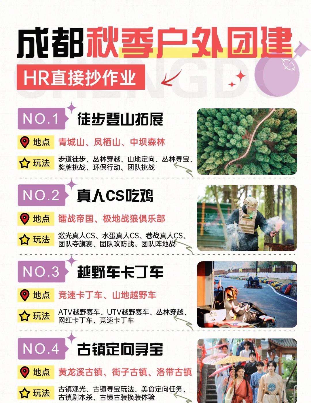 成都秋季团建不踩坑攻略🔥HR 直接抄作业 周末去哪儿 公司团建 企业团建 成都团建 成都团建策划 成都团建活动 成都徒步团建 成都越野车团建 成都卡丁车团建 成都古镇团建 谁懂啊家人们!🍂 秋天来成都搞团建,真的太幸福了!既不用忍受夏日的暴晒,又能拥抱满城桂香+层林尽染的美景~ 秋季户外团建方案已经整理好啦!直接抄作业👇 --- 🌲 徒步登山拓展|解锁自然里的团队默契 地点:青城山/凤栖山/中坝森林 玩法:步道徒步+丛林穿越+山地定向+丛林寻宝+奖牌挑战+环保行动+团队挑战 💡 场景想象:团队手拉手穿梭在茂密山林间,跟着地图找隐藏线索,完成“环保捡垃圾”“团队接力攀爬”等任务~ 既能锻炼体力,又能培养协作力,结束后还能在山顶拍集体照! --- 💥 真人CS吃鸡|沉浸式“战场”释放压力 地点:镭战帝国/极地战狼俱乐部(专业场地更过瘾!) 玩法:激光真人CS/水蛋真人CS/巷战真人CS+团队夺旗赛+团队攻防战+团队阵地战 🎮 谁能拒绝“枪林弹雨”的快乐?!男生女生都能秒变“特种兵”,组队埋伏、突袭、守据点… 打完团建还能去周边搓一顿火锅,碳水+胜利buff双重满足! --- 🏎️ 越野车卡丁车|速度与激情的碰撞 地点:竞速卡丁车/山地越野车(爱飙车的宝子狂喜!) 玩法:ATV越野赛车/UTV越野赛车/丛林穿越/网红卡丁车/竞速卡丁车 ⚡ 亮点:团队分组驾驶越野车冲进丛林,或是踩着油门在卡丁车道上竞速… 肾上腺素直接拉满!还能设置“团队计时赛”,考验配合度,输了的小组请喝奶茶,赢了的…继续嗨! --- 🏮 古镇定向寻宝|古风+解谜的双重快乐 地点:黄龙溪古镇/街子古镇/洛带古镇(选个最有feel的!) 玩法:古镇观光+古镇寻宝玩法+美食定向任务+古镇剧本杀+古镇古装换装体验 👘 穿上汉服逛古镇,一边打卡古建筑,一边完成“寻找非遗手艺人”“品尝当地小吃盖章”等任务… 甚至可以安排「古镇剧本杀」,全员化身古人破案,结束后还能拍古风大片,出片率100%! --- 💼 一站式服务,解决团队出行烦恼 💼 欣遇团建提供从活动策划到执行的一站式服务,确保活动的顺利进行。📝 您只需告诉需求,剩下的交给我们来操办。无论是活动流程的设计、场地选择还是餐饮的安排,我们都将为您考虑周全~
