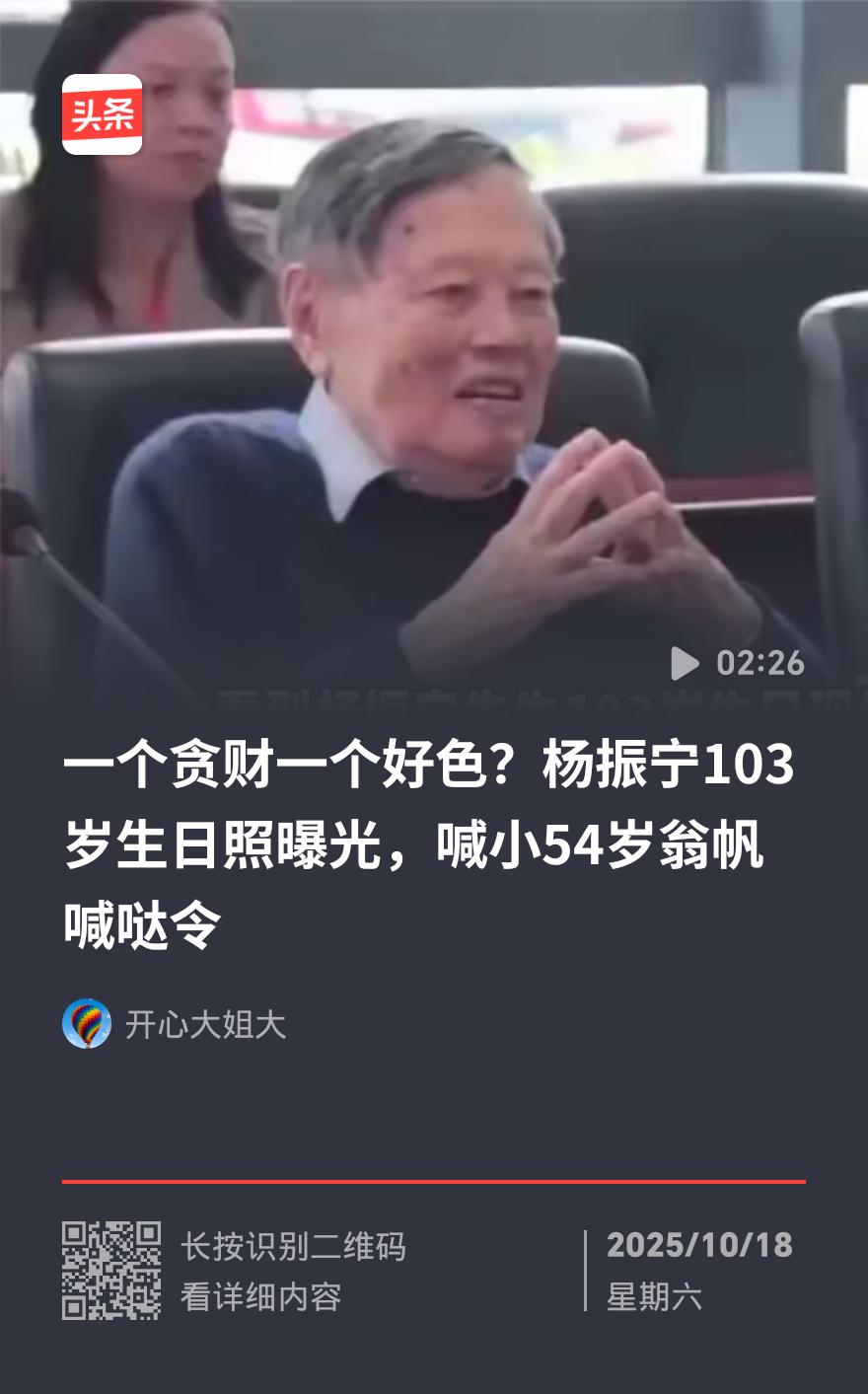 2025年10月18日,103岁的“物理界顶流”杨振宁先生在北京离世,朋友圈瞬间被这则消息“霸屏”。 这位曾放话“要拿诺贝尔奖”的大佬,年少在战火里挖书苦读,留美时从“实验炸炉选手”转型理论物理,35岁就捧走诺奖,留下的理论像“物理界的地基”,撑起后续一堆大奖。 他更是“家国铁粉”,中美刚破冰就回国,捐钱捐资料还给大一新生上课。如今先生走了,但编号3421的“杨振宁星”还在天上亮着,继续当科学路上的“灯塔”。物理诺贝尔奖 物理诺贝尔奖 杨振宁,翁帆