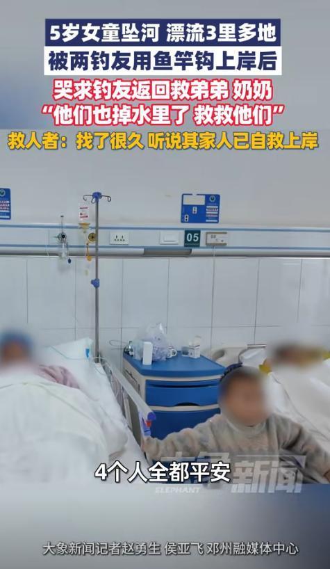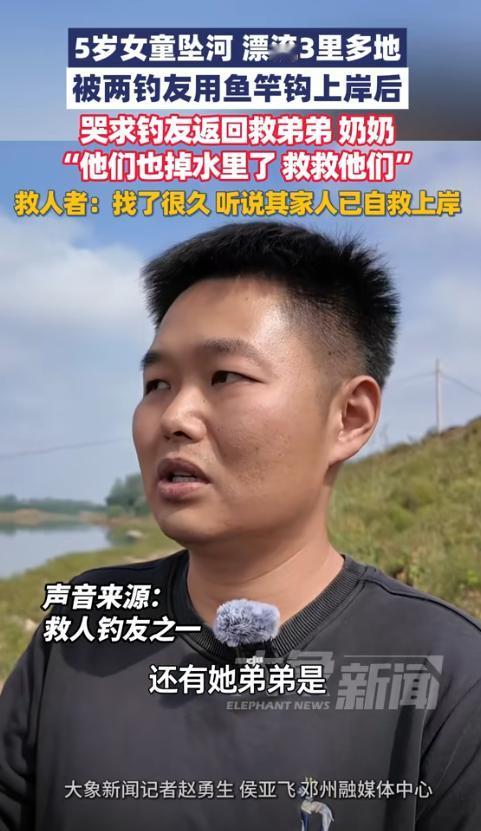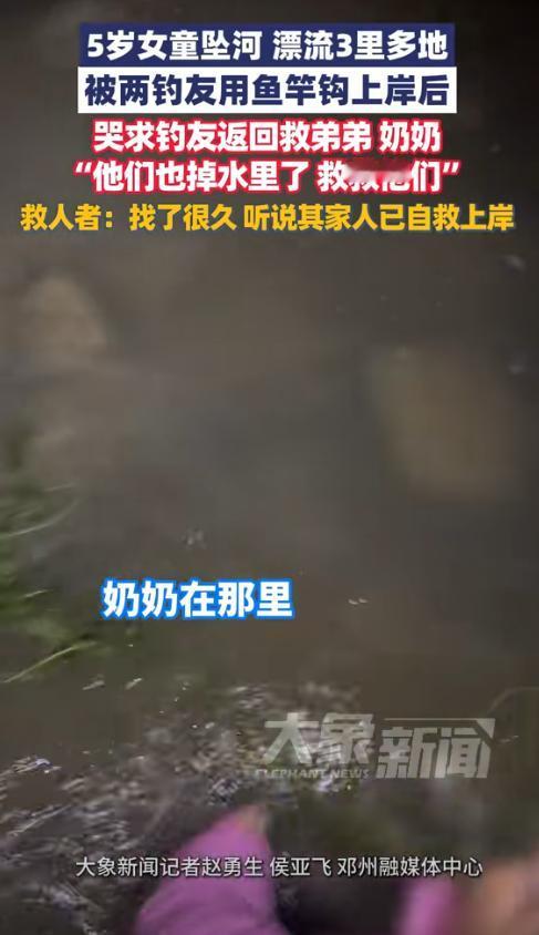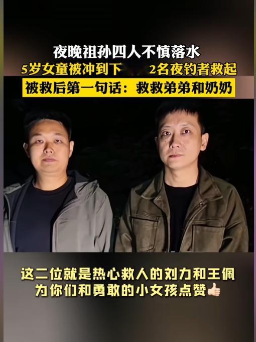 这是几世修来的福气!10月13日,河南邓州,一名5岁女童坠河,漂流3里多地,被两钓友用鱼竿钓上岸。可是她上岸后的第一件事情,却是哭喊着:“救救我奶奶和弟弟,他们也掉到河里了!”两钓友吓一大跳,连忙报警。 10月13日河南邓州王佩和刘力这两个钓鱼爱好者,正守在河边等鱼上钩,突然一阵微弱的哭声打破了夜的宁静,起初他们还以为听错了,可声音越来越清晰,分明是孩子的哭喊。 王佩和刘力立即用头灯光扫过水面寻找,只见一个红色身影在湍急的河水中载沉载浮,那是个穿着羽绒服的小女孩,御龙湾这段河水深达七八米,河岸陡峭,水下还有乱石和废弃铁丝,贸然下水等于送死。 时间不等刘力灵机一动,抓起手里的路亚竿,这根平时用来钓鱼的竿子,现在成了救命稻草,两人配合默契,一次、两次、三次...鱼钩终于在第四次尝试时勾住了女孩的羽绒服。 接下来的八分钟漫长得像一个世纪,他们既不敢用力过猛怕衣服撕裂,又担心动作太慢孩子体力不支,每收一点线心都提到嗓子眼。 女孩终于被拉上岸了,可让所有人意外的是,这个刚从鬼门关走了一遭的5岁小姑娘,第一句话竟然是:叔叔,快去救我奶奶和弟弟,他们也掉河里了。 两个大男人当场愣住了,顺着孩子指的方向望去,上游漆黑一片哪有人影,可看着女孩焦急的眼神,他们不敢怠慢赶紧打电话报警。 很快真相大白,原来女孩的爷爷骑三轮车载着一家人过桥时,不慎连人带车翻进河里,落水地点水位较浅,爷爷奶奶和3岁的弟弟很快爬上了岸,可等他们回过神来,5岁的孙女已经被急流卷走了。 这个小女孩就这样在冰冷的河水里漂流了整整3里路,羽绒服提供的浮力成了她的救命符,直到遇见正在夜钓的王佩和刘力。 事后小女孩被送到医院,医生检查后女孩除了体温偏低,生命体征基本稳定这简直是个奇迹,更让人动容的是,这个孩子在生死关头,心里装的不是自己的安危,而是家人的安全。 当地派出所已经着手为两位救人英雄申报见义勇为荣誉,可王佩和刘力却很低调:当时就一个念头,不能让孩子出事。 这件事也给大家敲响了警钟,御龙湾河段的安全设施严重不足,护栏缺失,救生设备更是无从谈起,农村地区的水域安全问题亟待重视。 据统计农村儿童溺水事故中,近七成发生在监护不到位的情况下,特别是老人带孩子,安全意识相对薄弱,这次虽然化险为夷,但暴露出的问题不容忽视。 麻烦看官老爷们右上角点击一下“关注”,既方便您进行讨论和分享,又能给您带来不一样的参与感,感谢您的支持!