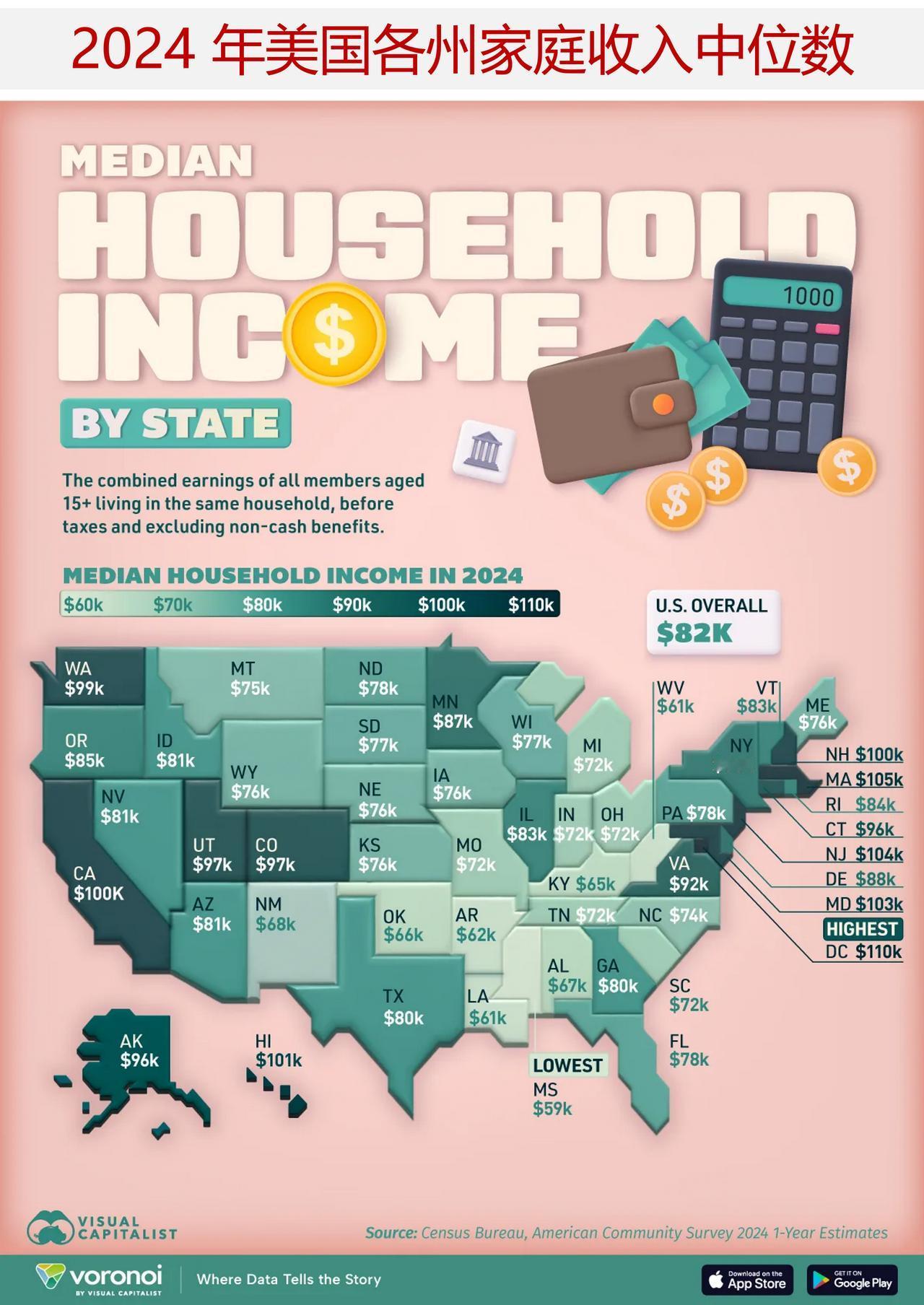 一图读懂2024 年美国各州家庭收入中位数 美国各州的家庭收入中位数差异很大,这取决于地理位置、产业结构以及生活成本等因素。 下面图表依据美国人口普查局“美国社区调查”的数据,描绘出了全美 50 个州在 2024 年的中等家庭收入情况。该数据是截至 2025 年 10 月的最新数据。 2024 年美国的家庭收入中位数为 81604 美元,其中哥伦比亚特区的收入最高,为 109707 美元,紧随其后的是各沿海州。 数据显示,高收入州和低收入州之间存在显著差异,其中低收入州的家庭收入中位数约为 59127 美元。收入最高的华盛顿特区与收入最低的密西西比州之间的差距为 51,000 美元。 ——高收入地区集中在沿海地区 家庭收入最高的州大多集中在沿海地区,科罗拉多州是内陆地区收入最高的州,位列榜单第九位,家庭年收入中位数为 97113 美元。犹他州是下一个非沿海地区收入较高的州,家庭年收入中位数为 96658 美元,总排名第 10 位。 位于科罗拉多州和犹他州之前的这八个沿海州,其家庭收入中位数均不低于 99,000 美元,均比全美家庭收入中位数高出至少 20%。 这些沿海地区得益于先进的技术、专业的服务以及完善的政府部门,这些部门往往能提供薪酬更高的工作机会,但同时这些地区的生活成本也相对较高。 ——南部各州的家庭收入中位数低于全美平均水平 美国南部的各州家庭收入普遍较低,常常远远低于全美家庭收入中位数(81604 美元)。 在密西西比州的收入中位数为 59127 美元之后,接下来收入最低的两个州分别是西弗吉尼亚州(60798 美元)和路易斯安那州(60986 美元)。 低于 65,000 美元的其他州(低于全国家庭收入中位数 20%)有阿肯色州和肯塔基州,其家庭收入中位数分别为 62106 美元和 64526 美元。 虽然这些数据明显低于全美家庭收入中位数,但它们与较低的住房及生活成本相符,从而形成了更为均衡的生活水平。