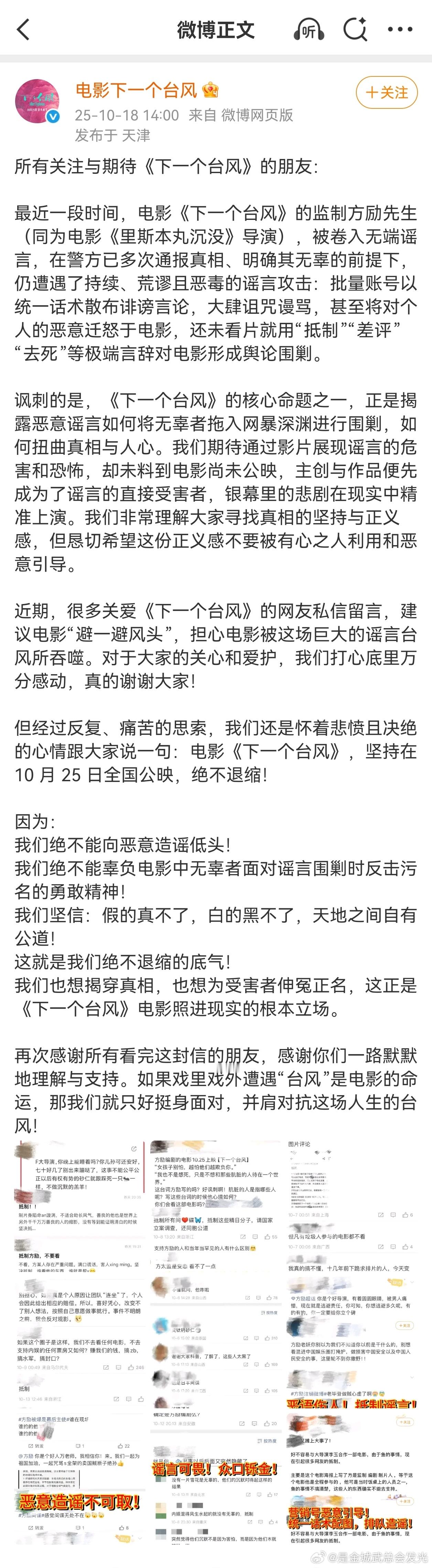 希望这场从银幕到现实的“谣言台风”早日过去,更多人看清 网 络 暴 力的真相,10月25日电影正常上映,也是时候让对电影的评价回归作品本身了!造浪吧国庆档