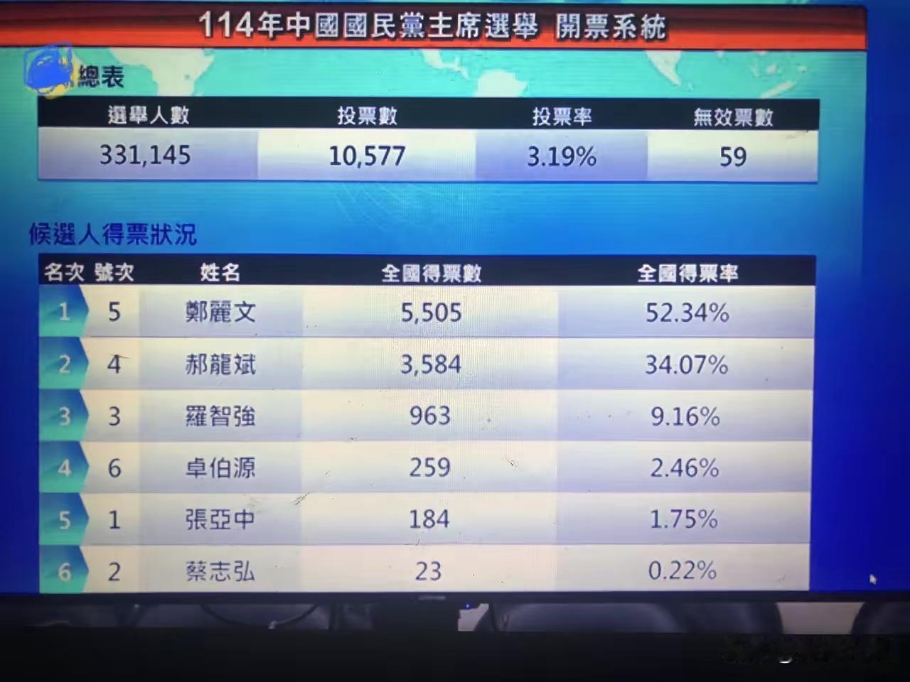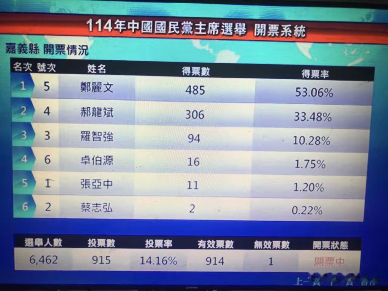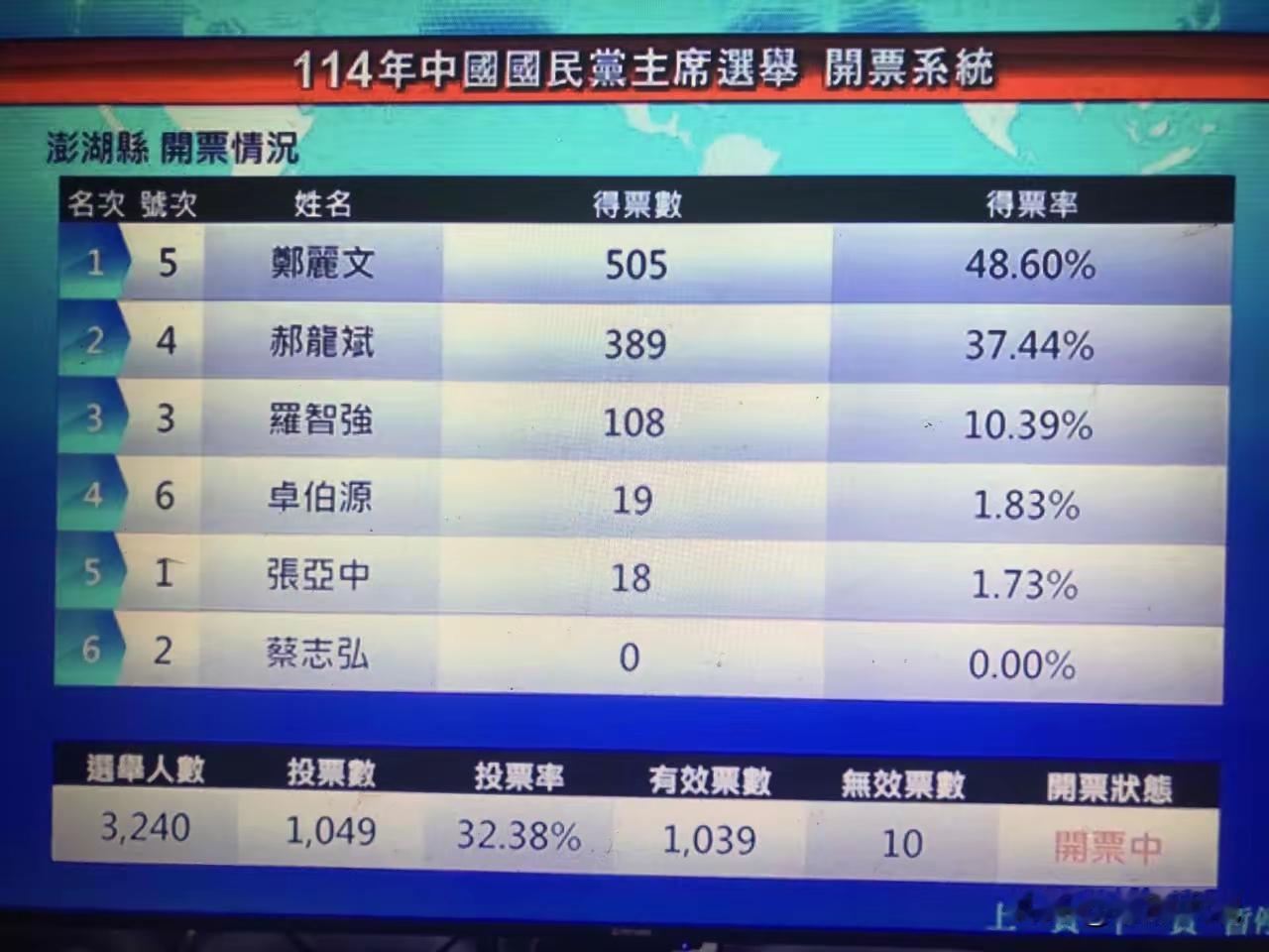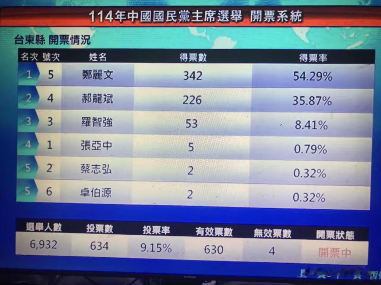 国民党主席选举,最新结果,截止18日下午17时,各地投票统计,目前郑丽文遥遥领先郝龙斌,排名第一。综观最终结果,待19点以后。郑丽文加油!!