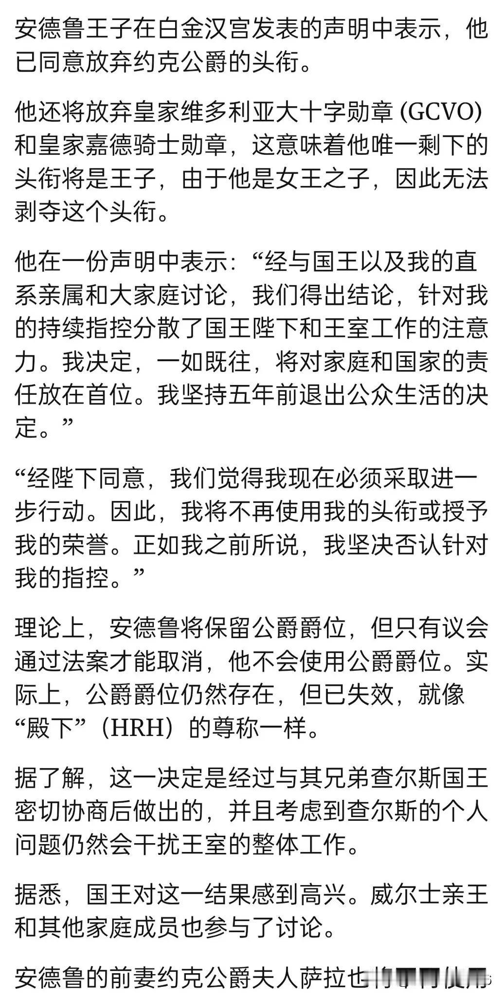 10月17日,综合《卫报》等多家媒体报道,因涉嫌卷入爱泼斯坦性侵案,英国安德鲁王子在与国王商议后,于白金汉宫发表声明,宣布自愿放弃约克公爵头衔、皇家维多利亚大十字勋章(GCVO)以及皇家嘉德骑士勋章,仅保留王子头衔。
