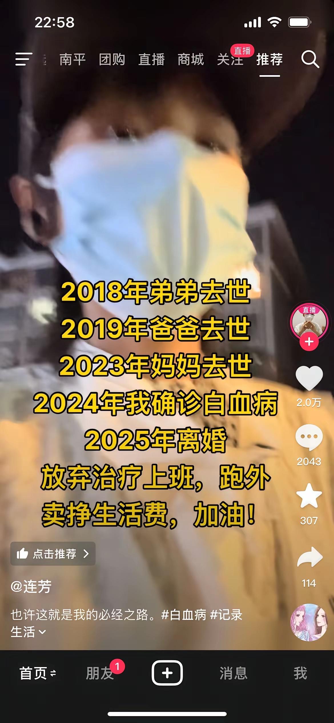 2018年家中唯一宝贝的弟弟去世 2019年家中的顶梁柱爸爸去世 2023年家中唯一的亲人妈妈去世 2024年就剩她一个人却被确诊白血病 2025年的她独自一人治疗放弃了工作, 开始了她的外卖之路。 谁能有这位女孩的身世凄惨,编剧都写不出这样的剧。女孩2024年确诊白血病,独自一人面对这个世界,她又何尝的不甘心。 世界是不公平的,你的努力我们都看在严重,相信在苦难之后一定是彩虹,坚持下去,生活一定没有你想的那么糟糕。 陌生人的加油。