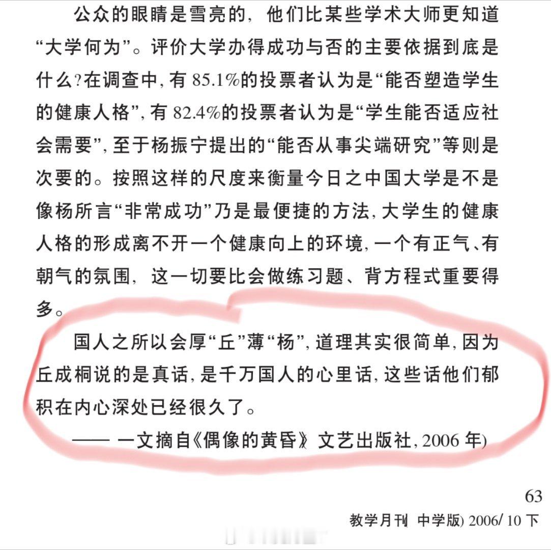 2005年8月22日,《中国青年报》以《公众冷落杨振宁支持丘成桐》为题进行了报道,公众厚“丘”薄“杨”成了当时的热门话题。