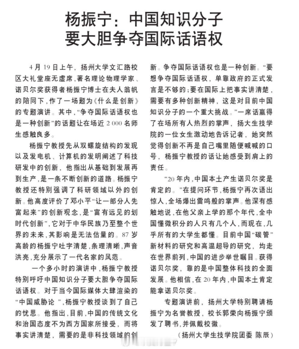在2009年前,杨振宁就呼吁:“中国的知识分子要大胆争夺国际话语权。”